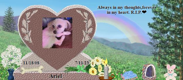 Ariel, my sweet girly. Such a sweet personality, full of love and joy. My first goodmorning my last goodnight, she was always by my side. She would be there to comfort me when I was feeling sad. And brought so much happiness to my life. She always wanted to shower me with sloppy wet kisses. She followed me everywhere, And whenever I went to the bathroom she would sit and wait till I finished, then she would do her little dance and bark at me to tell me she needed her treat. Ide have my afternoon coffee and there she was waiting for her next treat. Ariel was 14.5 yrs old. But still acted like a puppy. But her body was telling her to slow down, when she started getting seizures and her kidneys started failing. On July 11.2023 at 8.15 pm she lay in my arms and passed away. She will be forever missed. And was loved so very much. I love you my sweet girly. R.I.P. ❤️ |