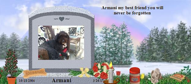 We picked Armani up at the Airport he was so tiny and afraid. It was that day he became part of our family for the last 13 years. He met Franklin who was older and not too happy to have a new puppy around. Franklin helped teach him the ropes. Armani was energetic, kind and very dedicated to the ones he loved.He loved to play ball, go for walks at The dog park and visit with his cousins Simon and Delores. By far his favorite activity was cuddling up with Roger on the couch at the end of the day. You were tough yet fragile and loved by everyone who met you! We will miss you! Thanks you for adding extra happiness to our days.❤ P.S. don't eat the grass on the other side of rainbow bridge😊 Please also visit charlie. |