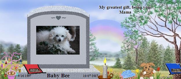 10/12/2017 - You just left me. I know you had to but I am trying to figure out how to live my life without you. If my love and tears could have kept you with me, you would have lived forever. When we found each other, who rescued who? You were my foster baby for two days. Then you became my everything, I adopted you and will forever be your mama. I love you Bee. I miss you so much. Mama is still holding you tight. 10/14/2017 - Today marks 1 week. So many people have been supportive here on this site but for life here at home everyone has just gone on but me. I still feel so much pain, loss and I can't see right now that will ever change for me. I just want you back. I still cry a lot and just can't seem to care about anything or anyone. I am trying to love the other dogs but all I can do is feed them and make sure they have water. They are trying to give me cuddles and they know I am sad but all I want is you. I know you were so tired and I know you stayed with me as long as you could. Since you were a rescue and we didn't find each other until you were 12 years old, I feel cheated. I only got to give you a happy ending. Eight years together was just not enough. Know that I am still holding you as tight as I can in my heart. I will never let you go. You are my everything. 10/21/2017 - Hey my baby. It's been 2 wks. since I helped you make your way to the bridge. I still feel empty inside and cry a lot. I wish people would just leave me alone and let me grieve for you. Yesterday was hard. I thought of me kissing you on your little head saying "I can never get enough kisses!" I am still holding you tight my baby. You will always be my everything. 10/26/2017 - I said I would only write on Saturdays. At least here. I started an journal of our days together last week. I am having such a hard time remembering all the great things we did together. I guess my heart is so filled with grief. I miss you so much my dear baby. Last night all I wanted to do was be with you. I cried myself to sleep, holding your bed and some of your things I put in it. I have not moved it. It is still above my pillows where you always slept and we cuddled and gave you massages. Never gonna let you go Bee. Forever holding you tight my sweet poodle. 10/28/2017 - Cried myself to sleep holding your picture last night. It is 3 weeks today my baby. I don't know how I am going to last missing you like this day after day. You are my life. As I told you for so many years, "You are my everything". 11/7/2017 - One month. Still miss you so much. Still cry for you and nights are really hard without you. I keep telling myself you are in a better place now. You are full of energy, loving your food and doing all the things you did when you were younger. You are not hurting or lonely, it's only me that is. Just the one you had to leave behind. Until I see you again my baby, I will hold you tight. Please come in my dreams. Show me signs that you are near me. Know that when you left me, you took a huge part of my heart with you. I am with you Bee. 11/23/2017 - Oh my sweet Bee. The 1st holiday without you. Support group says that you power through and make small changes. I am doing that. I am cooking for Dad and Alex but here's a twist, Samantha is staying for dinner. She even helped me cook yesterday and we are going to play tennis this morning. She's not happy about not doing Christmas this year but I can't do Christmas and my birthday without you this year. I will do something but it will be changed. Dad and Alex are going on a trip so they won't even be here. I will celebrate my b-day and Christmas with you. I will have to think of something you and I would like. You and me, and that's the way it's suppose to Bee. Remember how I always said that to you? Well, it's not Happy Thanksgiving this year. Haven't said that to anyone. It's "Have a good Thanksgiving". I love you and miss you so much. I write in a journal of our memories together, sing your song to you, and say good nite to you every nite. I can't wait until I see you again. Life is so empty without you in my arms. 12/7/2017 - Two month and 19 mins. since you closed your eyes forever. I hope you can feel me Bee. Hold me in your heart until we are together again. Know that I think about my perfect poodle all the time. I miss you more and more as each day goes by. My sweet Bee, you were my world. I have the special candles burning, the ones I only light on your anniversary, I wore my necklace, bracelet and earrings that have your birthstone today at work. I wear them only on your anniversary. I am going to start wearing the cheaper things everyday. I am still not ready to touch things of yours. All your clothes are still in your dresser, your bowls and spoons are still in the cupboard. I have had oil paintings of you done since you have been gone. Everyone loves painting you. I have signed releases to allow them to post them on their web sites. It's hard to think every day that you are not with me. I still write in the journal. It helps. It's really the only thing that makes me feel like we are having one of our little talks. I miss our talks, kissing your little forehead, the massages 2 or 3 times a day. You loved your massages. I changed your residency. It's winter here now. I put up a Christmas tree for you at your residency. I won't be having Christmas here at home this year. Just can't without you. I am hanging a stocking for you, Lillie and Cindy. I hope the three of you have become close. Tell Lillie and Cindy I didn't forget about them. I am sure they know that and know that you were the Queen Bee. I love you sweetie. 12/31/2017 - I made it through Christmas, my birthday, and now I guess I am doing New Years. It's now 2038 hrs. Almost 2018. A new year without my Bee. I have been alone since the 24th. I sent Dad and Alex on a trip. They went to Canada to freeze their butts off. I couldn't do these holidays without you this year. I have been lighting a candle for you and your