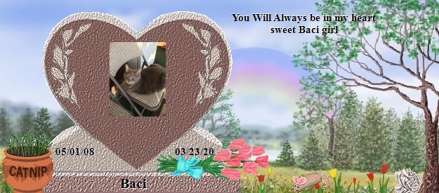 I didn't have you since birth. I rescued you at the age of 4 years old.. I was your 3rd home and your last. I often wondered how the humans before me did not care for you enough to take care of your health issues. You came to me with bad teeth and very underweight. It took a while but you gained 6 pounds. You were so beautiful and loving. You learned to trust me and we soon developed a very special bond. You did come with a lot of health issues such as food allergies .. and later pancreatitis and diabetes. I found a couple of amazing doctors and vet technicians that took care of you. You would go outside with me and play in the yard. You had lots of cat trees in the house and your little stuffed lamb that you loved to cuddle. You like popping catnip bubbles and bring me presents of lizards. You loved being brushed .. you were such a good girl.. never tore the furniture. At night you would lay on the towel and the foot of the bed and then lay on my chest and rub your face against my cheek. I only wish I did have you as a baby and maybe I could have prevented your health issues from becoming so chronic. They knew us very well at the Specialty Animal hospital. All the staff loved you but knew you could be a little challenging. You had a mind of your own. You would sulk when I got back from doing dog volunteer work. You could smell the dogs on my clothes and you would sit and turn your back to me. You always welcomed me at the garage door when I came home. When clients came over ...you always had to come into my workroom to say hello. I knew you weren't feeling good the last few days and it made me so sad because I knew your time was short with me. Even the best doctors couldn't keep the diabetes and pancreatitis in control. 4 of us made that heartbreaking decision. I will always be incredibly grateful that you came into my life. Hopefully you have met my other beloved fur babies Molecule and Kahlua. I miss you my sweet baby girl every day. Please don't forget me. Visit me sometime.... even in my dreams .. please send me a sign you are okay. Love you Baci girl. XOXO Mom 8-1 2020. I look in the corner of my bedroom and living room.. your cat trees are gone. I donated them to a cat rescue organization. I miss you so much little girl. some days are so much more difficult without you. I miss you so much. XO. 2-1-2021 I"ll love you forever XOXO 3-23-21 It's been 1 year that you have been gone and I still miss you so very much. Your little box sits on top of my dresser along with Kahlua and Molecule. I miss you crawling onto my chest at night and rubbing your face against my cheek. XOXO 3-3-22 It's coming up on 3 years I had to say goodbye. You will always be in my heart sweet Baci. XOXO 3-20-23 you went over Rainbow 🌈 bridge 3 years ago ... feels like yesterday.. I miss you ❤️ 3-23-23 I lost you 3 years ago .. I still miss your little face 💕 3-23-24. I still miss you.. love you 💕 3-23-25 I still think of you often my baby girl ...love you...mom💕 3-1-25. Hi my baby girl. Always in my heart my Baci girl 💕 |