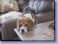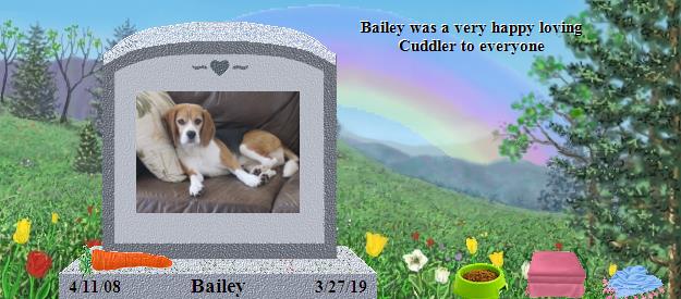 Bailey & his sister arrived via jet from the North Carolina breeder where they were born. From the moment we heard them bickering in the back area in Newark airport & the attendant announced " I think your package arrived!" I knew they were special when we picked them up on Father's day in 2008. He looked at me & licked my finger & we bonded immediately. His sister was & still is on the independent side but he was always a cuddler as was an accurate description by the breeder when we saw "wolfee's picture as he was called by him. Puppy Bailey & his sister Penny bickered & wrestled in their carrier all the way to our home in Flemington & made themselves at home. The 2 of them were inseparable and always interacted with each trying to establish themselves as the alpha but Bailey was always more of a lover except when bickering with his sister or competing for a spot on the sofa or for attention from us. Bailey bonded with me more than his sister Penny & he had a way of always looking right into my eyes with his big beautiful, expressive Beagle eyes. He had a way of always wanting to be where I was & would always leave whatever spot he was laying & jump up to where I was sitting in the family room where they spent most of their time. He would lean up against me upright & lick my face & contentedly go to sleep or as he was relaxing would look at me & crawl closer until he was touching. We developed almost a physic bond as he got a little older & would often come to my side of the bed at night when I was asleep if he wasn't up there already & I would always know he was there even though he didn't make a sound & he would trot back to his bed on the floor & wait for me to cover him again with his blanket & sigh contentedly. As puppies they loved playing with sticks particularly Bailey, a habit he kept all his life & would often find a small stick and run in a circle around Penny and tease her with it delightedly barking at her all the while because he saw that it annoyed her! Bailey loved being outdoors & going for walks even as a puppy and would often stop to sniff at a flower if he didn't try to eat it first! He especially loved playing in the snow in the winter & would jump into it like a little kid & stick his whole head in it. The 2 of them went on vacations to the Outer Banks 4 times with us & their great delight was as soon as we arrived at the beach house we rented would race around chasing each other usually initiated by Penny, howling & barking with delight all the while until they got tired. If they got wet from rain they would make a big production of rolling around to dry off & bark & howl at each other as they did it & Bailey especially was very expressive and would show his delight with a variety of things in this manner such as after getting treats, or a blueberry he loved, or his food or getting into his soft bed or after brushing his teeth and have a distinct bark when he did that. The 2 of them loved the soft sofas & blankets & loved covering themselves up with them. Bailey went a step further than she does & would often rearrange the blankets by nosing at them like she does but he would also pick up the blankets with his mouth & move it where he wanted it like he was hanging laundry. This was preceded a lot of times by him rolling around & howling making sure you were watching him! Bailey would call me from the bottom of the steps when I was upstairs with a different howl for that purpose usually because he wanted his blueberries I would give them every morning before I went to work or on weekends when he wanted to go with me to get coffee. She wanted to go too but let him do all the work. Bailey was a very happy typical Beagle that loved to sniff, snack & snooze especially in the sun, either in the window or outside where sometimes in the yard he would just flop over because he wanted to lay out there. They were very agile & leaped around on the furniture in the family room like monkeys which for him ended up causing some spinal issues later in his life. He would get too crazy sometimes & over do it & hurting himself & would have to be forced to stay quiet for a few days: very difficult for an active Beagle! Thanksgiving Day 2017 they were getting crazy in the morning & chasing each other & he hurt himself because later that day he became very quiet & wasn't very hungry, unusual for him, I took him to the emergency vet early that evening & got an Xray that showed that he had an issue with his spine & suggested Rimadyl but the Xray also accidentally showed something in the corner far more concerning. After further study the next day we found that Bailey had a Thymoma. ( Tumor of the Thymus) I think God wanted us to see that to take action because if Bailey didn't hurt himself he would have never had an Xray & caught that. The usual surgery or chemo was suggested by the emergency vet but only might keep him going for 6 months to a year at most but as this point he was already over 9 & our own vet thought there were other less invasive options such as a change in diet & Chinese herbs compounded to shrink tumors. She also suggested a canine Chiropractor which worked wonders for his spine & was was back to himself running around & playing & actually enjoyed going every 2 -3 months for his Chiro treatments. The doctor would have him walk for a distance to see his gait so she knew how to adjust him & laughed when he would cheat & cut the walk short to get his treats. As far as the diet & herbs it enabled him to have a great quality of life & the thymoma seemingly had no real effect on him until it caught up with him on March 27th, 2019. The weekend before he suddenly started breathing much more heavily & a follow up Xray showed the tumor had grown to the point that it was starting to crowd his heart. He had a much better & longer happier over a year with us than he would have had with the surgery or chemo that would have made him sick for the time left with us. God watched over hi