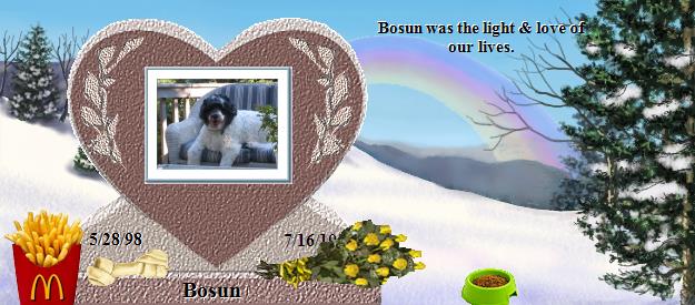 Bosun my furson. On July 16th you will be at Rainbow's Bridge for 3 years. Your big brother Christopher joined you on August 16, 2012 and Mom-Mom joined you on May 1, 2013. Now your little sister Matey has joined you as well. We have such wonderful memories of you as a puppy, of you & Matey playing and swimming together. But especially snuggling with your mom. I miss you so much and dad & I look for your shining star every night. You were our Boy and your love was unconditional. When you had to say good-bye, you left a void in our hearts and in our home. Matey felt it as well and looked for you throughout the house. Matey picked up a lot of your habits, good & bad. You should be very proud of her. I know I will see you again and get those sloppy kisses that I miss so much. Please enjoy those that are with you, but please be watching & waiting for dad and me. Love you my sweet boy! Mom |