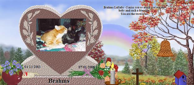 Brahms Lullaby - a true angel with fur on. You were rarely without a purr. You loved everyone -cats, people,and unless something scared you, you purred, you loved like I've never seen You were Scotty Underpants beloved brother and Lucy Bear's little baby and Gus's loving friend and Laurie's little darling. On July 1st, 2006 you disappeared in the night and I never saw you again, it was the worst day of my life. You are only 3 years old. I think of you in heaven with Jesus and it is my only comfort. You were born in my house and the day you were born I knew I wanted to keep you and one of your brothers - Scotty Underpants who is thankfully still with us and who we love dearly and is so funny. But do we miss you Brahmsies. Scotty used to cuddle up with you at night and play with you in the day time. He gets extra love and prayers now and it took Lucy a long time to smile again after you left us. Gus knows how much I miss you and he is my great comfort - at 16 years old and diabetic, he is a special blessing also I thank God for every day with him. 18 pounds not fat, just a giant orange teddy bear with a white face and white paws and turtleneck and tummy. Oh Brahmies I loved you so much and still do but miss you nearly more than I can take sometimes. I think of you in heaven knowing Jesus has you in His loving hands. November 26, 2006 Brahmies I remember you coming into the garden with me anytime I was outside with you. It was so hard to go into the garden this summer after you left us. But Scotty knows. The other night I was out cutting some plants down that I should have done earlier and while I was on my hands and knees, he climbed on my back and stayed there 10 minutes. He was remembering you and comforting me. He's your brother even though he's so different. Why did you leave us Brahmies? God knows I guess - along with the sadness there's a lot of good things this grief can bring. I love you sweetheart. Six months ago, missing you this morning Brahmies. Scotty Gus and Lucy and Laurie all tell you hello and we love you. March 20, 2007 - it is the first day of Spring, you love Spring Brahmies and even though it's only 20 degrees I know you'd be out there with Scotty playing with him and Lucy and loving Gussie cat. By the way Mr. Gus needs your angel prayers for him. He loved you so much you were so sweet to him. You treated him just like a favorite dad and were so considerate knowing he wasn't a young kitty cat like you. What manners and honor you treated the others with. My angel boy I love you.