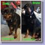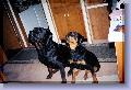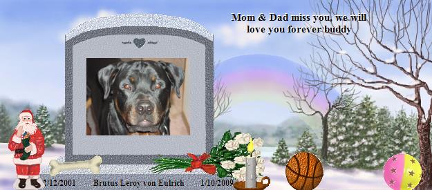 I would like to start this out by revisiting the last day we had with Brutus. He had a slight cough for about a week which we thought he may have gotten from us because we had one also. When he started not eating very much I decided to take him to the vet on 1/8/09 since we were going to be gone overnight on 1/9. His glands under his neck were swollen and he had a slight fever so he gave him a couple of shots, gave us 2 different pills to give him and took a blood sample. I came home from work on 1/9 and he seemed to be feeling better & his food was gone so we thought great he will be fine, the vet had called and said his white blood cell count was off the charts and wanted us to come in Mon. for x-rays to see if Brutus might have Blasto. We came home on 1/10 at about 10:30am and he was waiting at the back door with Jade as usual and went outside trotting to the car so he could mark the tires like always. When they came back in the house mom had given them some canned dog food that they got when they were good and he only ate about half of it, we also noticed that he still had somewhat of a cough. He went by mom on the couch and she brushed him out which he enjoyed so much & she noticed he was breathing a little heavy (panting). He went and laid by the washing machine by the back door which was unusual and a short time later Lisa heard a loud noise then Brutus scratched to go outside. Thinking back we think he may have gotten up and collapsed against the washing machine. When I checked on him outside a short time later I noticed he was laying in the snow on the sidewalk in back and panting so I called the vet because we thought maybe his temp. went up. When I went outside to ask if he would like to go for a ride, which he LOVES to do, he didn't even attempt to get up and I noticed his gums were very pale, almost white, which really scared me, I didn't tell Lisa. We had to drag him to the Bravada and lift him in, which is no easy task with 29-30 inch tall dog weighing 175 lbs and he wasn't fat. I noticed he had lost some control of his bladder while being loaded into the vehicle and after we got on the road I called to vet to let him know we would need help getting him unloaded. It took me half the time it normally takes to drive the 6 miles to the vet, praying all the way this wasn't going to be Brutus's last ride. We arrived there shortly after noon, got him onto the floor in the office and the vet looked him over. The glands were not swollen anymore but when he was feeling around it felt like there was fluid in his abdomen and then he felt a hard spot on the spleen. Both vets there felt it and they had both lost dogs to the same thing. They were almost completely sure that he had a tumor on his spleen and it had ruptured causing him to bleed internally, it is Hemangiosarcoma which is a very aggressive cancer and can form on most internal organs and/or skin, something we didn't want to hear. I think since he went so fast he may have had a lot of cancer in him, even though he showed no sign or symptoms. He said we could go to emergency care and have spleen surgery but he thought Brutus wouldn't make it that far, he was right. Lisa was sitting on the floor on one side of him and I was on the other side talking with the vet. Seconds before he passed he lifted his head up and looked for me, I could see his eyes were cloudy and knew it wouldn't be long, I immediately laid on the floor beside him and he put his head down as we rubbed his ears and petted him telling him he was a good boy and how much we loved him, then he went to sleep for the last time, in our arms at 12:45pm. We thank God he didn't have to suffer through a lot of pain and that we had the privilege to be there with him during his last moments, we think he waited for us to get home. I just wanted to say how the grieving is going, Lisa and I miss our Brutus with all of our hearts and even after almost 3 weeks there still hasn't been a day we haven't shed tears. Jade finally started eating her dog food again but it took her almost 2 weeks. The first day or so after Brutus passed it didn't seem to affect her too much but then she must have realized her beloved Brutus was not coming home to play with her, she stopped eating her dog food and spent most of the time laying on the bed in the room with a view of the garage and driveway, looking out the window waiting for Brutus. When we tried taking her for walks she would get to the end of the driveway and keep looking down the road and back at the house waiting for Brutus to come running to join us for our daily walks, but he never came. This made it really hard for us too but she finally started going down the road a little ways before she would not go any further and now she doesn't have too much of a problem going for walks and she doesn't spend all of her time looking out the window for Brutus. A few days after Brutus passed it snowed and even though we have a record snowfall this year, I welcomed it because it covered the tracks that Brutus had left all over the driveway and yard and made it slightly easier to cope. I am going to start with us, in August of 2000 we purchased 50 acres and moved out in the country, we are about 45 min. from Green Bay Wisconsin. We threw around the idea of getting a dog since we were out in the country and I had always like the Rottweiler breed, on February 11, 2001 my grandpa passed away unexpectedly and shortly after that we decided to get a dog to help with the grief. We found one in the paper from a family breeder, he was going to use him as a stud but his wife got pregnant so they decided to get rid of the whole litter and we ended up with a handsome male that we named Brutus Leroy von Eulrich, who just happened to have been born the day after my grandpa passed away. The name Leroy was in memory of my grandpa. We never knew you could love an animal so much and since we have not been able to have children yet, he was like a child to us. I am go