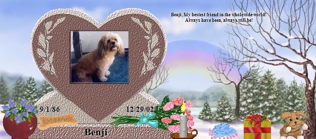 2/14/10 Happy Valentines Day Benji Meyer... I am sending alot of love to my bestest boy in the wholewide world. Your sister sends all her love too. Kiss is taking good care of me Ben, you'd be really proud of her. Its snowing like crazy and very cold. Remember when you were young, you would put your nose down and make like a a snowplow, now she does it. And just like you, when she gets snow packed between her toes, she holds her paw up and wants me to come help her. You babies, what would I do without you. You and Kiss are the best to ever happen to me...I still don't know what I did to get to be the mommy to the bestest boy and girl in the world. I love you the bestest. I miss you Ben, but will be with you again. Don't forget me and no chance I will ever forget you...mommies don't forget. Wag your tail, save kisses and the light is still on. Love mommy 3/29/2010 Hey Benjman, it's your mom. Just wanted you to know I brought you an Easter basket and it's now Spring. Kiss is doing a good job taking care of me, so please don't worry. You know I will never forget and I know that you are saving kisses in your belly for me. The light is still on and will always be. Kiss likes how you taught me to stop and smell the roses on walks. She likes all the toys and treats. She runs this house and me just like you did. You are both spoiled rotten and deserve every minute of it. I am very honored to have you and Kiss in my life. I am very proud to be your mom. You gave so much to me and gave my life meaning. Thank you baby boy. I miss you like crazy but wanted to stop by and tell you hi. Keep smiling and wagging that tail. I love you Benji Meyer. Your mom and sister, Kisses 8/7 Hey Ben, I know it has been way to long since I have been here to see you. I miss you so much and it hurts so much. Please look for your friends Jake and Marco who both came to the bridge this morning. You know the boys from across the street that I always took care of. Their mom just came and told me. I knew they had been sick but it was still a blow just now. It was also my last day of work. I know you will recognize them and show them the ropes. They like to play tennis ball and love milkbone treats, so you 3 boys should be fine. The light is still on,save kisses in your belly and remember that mommies never forget. I love you Benji Meyer. Your sister is in trouble right now and I made her go outside. She is doing a pretty good job taking care of me. I love bragging about you two kids, the loves of my life. I'll not be as long to visit next time, I promise. I am rubbing your little nose right now. Mommy loves you Ben. Remember that I will see you again.Love, mom 8/7/10 Hey Benjman. I know you are hurt cause I haven't been here to visit. Please forgive me. You know the boys Jake and Marco from across the street, the ones I watched when their mom and dad went away. hey cam eto the bridge this morning. Please look for them and show them the ropes. They loved to play tennis ball and eat milkbone treats just like you so you boys should all get along good. Their mom just came and told me and she is very sad. I am very sad too. Today was also my last day of work, so it has been a sad day all around. Please keep saving kisses in your belly, wagging your tail. Mommies never forget and you know I love you soooooo much.I promise not to be as long next time. I love you Benji Meyer. Love , mom 8/31/10 Happy Birthday Ben.Tomorrow is the big day. I wish I could take you to Dairy Queen for an ice cream cone. We had lots of good days together and we will again. I know you have lots of friends to run and play with. I got you a cake so you will all have a treat. Your sister and I will think about you all day. That is the best we can do to share with you. I love you and miss you, Ben. Save kisses,mommies never forget and the light is still and will always be on. I love you, Benji Meyer.Happy Birthday baby boy. I will see you tomorrow night. Love mom and your sister, Kiss 9-1-10 HAPPY BIRTHDAY BEN. I hope you are enjoying your cake and sharing with your friends. Your sister says bark, bark, bark and Im taking care of mom Ben. Dont worry about her, I am a pest and keep her busy. We miss you here and will see you someday at the Rainbow Bridge. Watch out for us and we will look for you in the rainbows. I love you Benji Meyer. I am saving kisses in my belly too! Take care baby boy, and have fun today. Love, mom 11/16/10 Hey Benjman, how are you today? Hope you know I think of you alot. It has been a rough time here with the job and Kiss has had to work triple time to keep me going. I finally saw a rainbow the other day but didn't see you, figured you were running around playing with all your friends, so I knew you were happy.It's winter now and I got you a blanket to keep you comfortable and warm.Hope to see you sometime soon in my dreams, cause I miss you like crazy.Your sister is doing a great job here, so don't worry. I am saving kisses for you and the light is still on and mommies never forget their baby boy, Ben. I love you Benji Meyer. Love your momma and sister,Kissey 12/24/10 Merry Christmas Eve Benji Meyer. Your sister is tearing open her presents. A continuation of what you started, the animal zoo. We miss you alot, its snowing out and you used to love it. Put your head down and made like a snowplow. She gets stood in the kitchen sink too, to melt all the snowballs on her paws. She doesnt like it either. You 2 are so much alike. She keeps me on my toes Ben. You were easier on me. She at 10 yrs. is still in her terrible 2's stage. I miss how you used to like to lay up beside me. She still wont do that. I hope you are doing well and having fun with all your friends. go be with your friends and play hard until I can be with you. Dont forget the girl is coming too. I love you. See ya tomorrow. Love mom You're in my heart forever, until were together again. the light is still on dont forget me 12/25 merry Christmas Benji boy Love and miss you. Ha