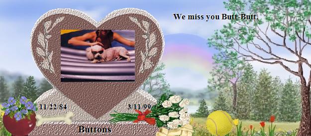 | I can't believe it's been two years since you left us, Buttons. Sometimes it feels like yesterday. We miss you very much. Hope you and Petu are having fun "dancing" up in heaven. Buttons, Gimli has joined you. I hope he doesn't bite you up in heaven. I miss my little monster, Gimli, so much, just as I miss you, Buttons. Buttons was a very spoiled and very loved miniature poodle. We got him when I was 15 years old (in January of 1985) and my brother, Steve, was 14 and my sister, Donna, was 12. My mom took care of him most of the time, and in the last two years, Steve took care of Buttons. One of my favorite memories of Buttons is the time that my mom had made blueberry pancakes for a Sunday breakfast. We had some leftovers, and she left them on a plate on the kitchen table and we went to church. Somehow, Buttons managed to get up on the table and eat about 5 or 6 pancakes. He left one pancake on my mom's pillow as a present. He was a very sweet dog but could be mischievious when he wanted to. Buttons suffered a stroke on a Tuesday night or Wednesday morning and Steve took him to the vet, who kept him overnight Wednesday night. Steve called us Wednesday night to let us know and we all prepared to go to the vet on Thursday, 3/11/99, to say goodbye, knowing that we would probably have to do that. The four of us (Mom, me, Steve and Donna) went Thursday morning and held Buttons for about 20 minutes in the lobby of the vet's office while we waited for Dr. Hart, and then we took Buttons in and let him be free of his pain. We miss you little Butt-Butt! See you in heaven one day.--------11/22/01 - Happy Birthday, Buttons! You would have been 17 years old today. We miss you so much. I have a little poodle/terrier mix puppy now - her name is Raven and she was born in 7/01. She is black (hence the name) like Petu was, but she has a white spot on her chest. She loves to lick just like you did. Sometimes it was impossible to get you out of my face, you liked to lick so much! I hope you and Gimli are getting along up there. I miss my little monster, Gimli, so much. His birthday was 11/2 - he would have been 10 years old this year. Today is Thanksgiving and I remember how much you liked the leftover turkey we brought home from Helen's. I'm thankful that we had you.--------------3/11/02 - Buttons, I can't believe it's been three years since you left us. We miss you so much. Raven does so many things that remind me of you - must be the poodle in her. I hope you are getting all of the blueberry pancakes you can stand up in heaven!------11/22/02 - Happy birthday, Buttons! You would have been 18 today! We miss you so much. Grandmom is now with you; hopefully you are on her lap.--------3/11/03 - I can't believe it's been four years now since you left us. We had a funeral today for Bert (Grandmom's sister), so hopefully you are sitting on both of their laps. We miss you so much, Buttons.-----11/22/03 - Happy birthday, Butt-butt! You would have been 19! We still think about you so much and miss you.-----3/11/04 - I can't believe it's been five years now since you left us. We miss you so much. --------11/22/04 - Happy birthday, Buttons! You would have been 20 today. I have a little girl of my own now (Sarah) who is 19 months old. She would love to pull on your hair just like she does Raven (and Sam used to try to pull on yours). We miss you.--------3/11/05 - Buttons, it's been six years now, so hard to believe. We miss you and love you.------11/23/05 - Happy birthday yesterday, Buttons. You would be 21! We miss you so much. You loved turkey at Thanksgiving!------3/11/06 - Hard to believe it's been seven years now since you left us, Buttons. Simba joined you on 12/19/05. Raven still does so much poodle stuff that reminds me of you!------11/22/06 - Happy 22nd birthday, Buttons! Mom-Mom, Donna and Sam are coming over to my house for Thanksgiving. We all miss you so much.-------3/17/07 - As of 3/11/07, it's been 8 years since you left us. We see dogs that look like you all the time and always think of you. We miss you so much.-----11/22/07 - Happy 23rd birthday, Buttons! I wish dogs lived longer than they do, it's not fair! Max and Raven are looking forward to going to Roanoke to see Ozzie and beg for Thanksgiving food! You loved leftover turkey, just like other dogs!----3/11/08 - Buttons, it's been 9 years now since you left us. We miss you so much. Skylar has now joined you - he was a big Golden Retriever! It's so unfair that you guys don't live longer :*(.---11/22/08 - Happy 24th birthday, Buttons! We saw a doggie, Toby, at Tim and Bebe's house that looked so much like you, but was part cocker spaniel. We miss you so much.------I can't believe it's now been 10 years since you left us. I recently uploaded a bunch of pictures of you to my Facebook profile and think about how much we miss you.-----Happy 25th birthday, Buttons! Toby reminds me of you every time I see him, and the way Raven hides her bones reminds me of how you would hide your bones, too! We miss you so much!----5/26/10 - Today is 9 years since we lost Gimli, and we lost you 11 years ago on 3/11/10. I saw a dog that looked just like you at the dog park, and then saw another look alike tonight at Burger King. We miss you so much.----11/26/10 - Happy belated birthday, Buttons! You would have been 26 - wouldn't that be nice? I sometimes see poodles that look like you and miss you.----5/27/12 - You have been gone for 13 years now, almost as long as we had you. I still see dogs that look like you and think of you. Yesterday was 11 years since we lost Gimli. You would have been 28 by now - how nice would that be to have a dog live that long??!! Miss you!-----11/22/14 - Today is your 30th birthday, Buttons! Happy birthday! Wouldn't it be nice if dogs lived to be at least 30??!! One dog in Louisiana almost lived that long. Max and Raven are still doing well, as well as Lucy and Bella (our collie/shepherd mix and our foxhound, respectively). Max is about 14 1
