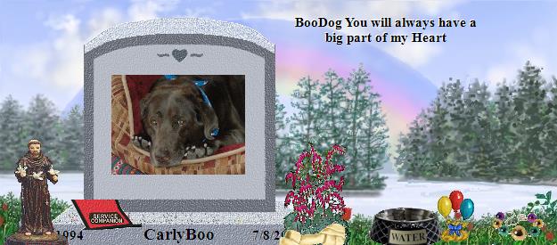 CARLOTTA aka: Carly, CarlyB, CarlyBoo, CarlyBooDog, BooDog, LittleGirlDog, FatFatWaterRat, KittyCat, PumpkinPie, IttyBitty, Thursday. Something is wrong. CarlyBoo did not drink very much this am, when I took her out she did not go and her stroller was dry. I figured I missed the puddle upstairs, which explains why she wasn't thirsty. (She often drinks and pees at the same time.) mmmph... there must be a puddle somewhere. When I got home after class I noticed she did not eat all of her bkf, but I found the puddle and her Hansel and Gretel trail of poo treats. Something wasn't right. When I'm in the shower she usually stretches out on the living room floor and soaks up the early morning sun, Today she curled up in front of the shower. Carly did not feel well. I took her to Dr. Tierse. I don't know what it is, his voice, his touch, or his love, but CarlyBoo always felt better when she saw him, but not today. The news was not good. She was in kidney failure. I took her home and tried to get her to eat and drink. She stayed with me Friday and Saturday. We stayed close and looked at each other confirming how special we were to each other. Neither one of us could sleep so I pulled out all the pictures I could find. We went through them and remembered the crazy things we did, all the places we've been, and all the people that touched our lives. We laughed about our wild adventures with Maxx and admired everything he taught us. We agreed that together we all had a rocking good life, and we were thankful for every day we had together. We knew that we were blessed to have known each other. If you are a dog person you know their wags and their smiles. You know when they are sad or don't feel 100%. but the look you only see once is the one that begs you, please help me, help me say good-bye. On Sunday I took her back to the clinic. That evening with our faces together, our hearts entwined, and with the love and support of family and friends, we smiled and said, "see you later". BooDog You will forever be in my Heart. Mommy |