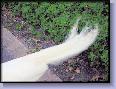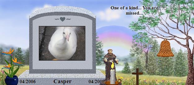 You were the tiniest little bird when you were born. It's a miracle you survived at all. I named you Casper because you were all white. What a beautiful bird you were, so grand with those white feathers and when you got older even more grand in beauty. From the start you were unwanted. Your mother rejected you, the other peacocks rejected you because you were different from them. When you were just a baby you took bread right from my hand.I always made sure you ate first to be sure you got enough food and then the other peacocks had their turn.You made your rounds around our community and at 5'oclock every night there you were, at my door, waiting to be fed. When you went missing we searched for you, fearing someone stole you. After a few weeks we were told you were just next door at another community.Were you accepted there? Did they treat you better? Maybe not because you came HOME again.What a sight you were Casper, all white sitting in the tree. People stopped to stare at your elegance, your beauty. You trusted us in the community didn't you? We let you down somehow. How could we have known you would be killed. The workers found your beautiful white feathered body sprawled on the ground, a shot gun wound they say. How could this be? How could someone have taken you from us? For what reason? I am grieving for you. I miss you so much. I still look at the trees and rooftops thinking I will catch a glimpse of your elegance, but you are gone. I didn't sleep for three nights and on Thursday came home and there it was...Don and Wilma left me a gift. It was one of your long white feathers. I could barely breathe when I saw it. I held it close to me. It was all I had left of you my sweet angel.I wish now I never prayed for you to come HOME. Had you stayed next door you would still be adorning trees, you would still be with us. Man is so selfish, we want what is meant to be free.You are free now, I know you are with my Fifi and I will see you both again. I am so sorry you were hurt, I hope you forgive man's cruelty,but I know that I cannot. I will miss you always... |
