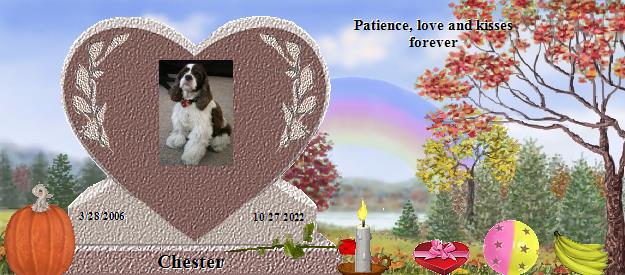 Chester was a pioneer -- always curious, always forging ahead. If anything was changed in the house, he would say "roooooooo" until we fixed it for him! Chester was the alpha to his littermate, Charley, and he made sure that we all knew it. They were always given identical toys, but Chester stole every one of Charley's toys and made sure that Charley couldn't have either one, at least for a while. Chester ate very slowly, and Charley ate very fast. Once Charley finished his food, Chester tormented him by looking directly in his eyes and chewing his food very slowly. Charley passed away suddenly 2 years before Chester. Although the first several months after that were very difficult for all of us, we are so proud of how Chester carried on. When Chester was just 2 or 3 years old, a baby bird fell out of a tree into our yard behind a wire fence, out of Chester's reach. Chester said "rooooooo" until Daddy and Mommy came to rescue the baby bird. Chester did not see where we took the bird. For the next 9 or 10 years until we moved out of that house, every single day he ran right out to the spot where he saw that baby bird and looked for it. Chester developed allergies and broke out in skin lesions when he was still just a puppy. First, Mommy put ointment on his "boogers" regularly, and Chester learned that this would help him, so he gladly rolled over when asked and even thumped his tail on the ground, knowing it made us happy. Then Mommy had to give Chester allergy shots 3 times a week. The first few shots were so mentally, emotionally, and physically challenging for Chester, Mommy, and Daddy. Daddy held Chester on his lap in a chair while Mommy tried to administer the shot. Chester managed to fight his way out of Daddy's arms almost every time. Mommy would end up in tears and then in the vet's office asking a technician to help. Finally, one day, Mommy said that Chester was a very emotional as well as intelligent dog. While she was struggling to give Chester a shot, she stopped and decided to talk to Chester. She told Chester how much she loved him and how the shot was going to help him. She said it would make his "boogers" go "bye-bye." She had tears in her eyes by the end of her "speech." Chester then buried his head underneath Daddy's arm and let Mommy give him the shot. He never made a fuss again regarding shots or other medical matters and was simply the best patient ever. Even with advanced arthritis and dementia, Chester continued to forge forward every day. He would never give up. It was so hard to say goodbye, but we know that it was the right thing to do. 16 1/2 years of endless love. We will always love you so very much, Chessy Boy. Rest in peace, snuggling with Charley once again. |