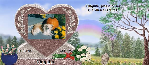 Chiquita you were the cutest dog ever. People always stopped me to ask about you and Strangers would say they were going to steal you from me. I first saw you when you were 5 days old and you stole my heart as I held you in my hand. Your mother MiMi was so nice and convinced me that chihuahuas were not always yippie and snappy! Gino begged me to let you join our family with Andy and our other dog Rosie. Remember when the farm dogs would come and bark for you and Rosie to come out and play? I am glad we let you in our lives and our hearts. Remember when I was married before and we had the beach house and Rosie would dig a hole in the sand and you would jump in the deep hole and I would say "dig dig dig!" and you would dig as if you had done the whole thing! The funniest thing about you is when you wanted to be picked up you would turn around and back up ... Your eyes were always looking for me and now I miss feeling them on my back. I miss holding you and asking you for a kiss. Vinnie and JayJay and Angel know you are gone and they are all staying close to me. Even Catalina is looking for you. I am so sorry you got that horrible kidney disease and I am so sorry it took your life. Chiquita, I want you to kiss Rosie and Chelsie from me and tell them I miss them so much too, and the ferrets, Rocky, Daisy and Cleo, who you loved to play with! Martini is missing Gino so much so be sure to give her hugs and kisses from him! Sadie, Uncle Ricky's boxer is there too! Give her plenty of kisses from us! Look for FiFi too! She misses Pop Pop so much! ChiChi is in Rainbow bridge also to kiss away your tears. He always licked your eyes clean. Chickie baby, I miss you. I love you! Daddy misses you too! So does Brittany and especially Sean, He keeps asking where you are. Everyone from the family is so sad. Pop Pop cried on the phone, Aunt Donna is calling me everyday to ask how I am doing and Uncle Ricky is sad. They were some of your favorite people. They loved you too! Daddy and Gino put you in the yard next to Rosie so I can visit you each day. Sean and Gina were there too. Our eyes were crying so much we could have filled a river. You will be missed so much. You are so much more than a dog, you are my dogter! I love you Chiquita!8/18 Today is your 13th birthday! Happy Birthday my little Chick Chick! I feel so empty without you by my side. I hope this feeling passes. I know you are not suffering anymore, but it is still hard to hold back the tears. I love you Chiquita! Mommy's little girl! My Cotter Baby Jones! 9/4/2010 Chick Chick, I was just looking at pictures of you and when I looked into your eyes I burst out crying. I miss you. Do you hear me cry? DO you stop playing when I am calling your name? I can't help it, it still hurts so much. All the loving from Vinnie and JayJay does not help how much I miss you. 9/16/2010 My Little ChickChick, it has been over one month since you passed away but not one minute goes by that I don't think about you. I can't believe how much I miss you. You were so much a part of my life. I hope you are happy and having fun each day. I miss when you used to go under the blankets and press up against my back to keep warm. And when I would lay on the sofa for a nap and you had to lay right on top of my waist. I am so empty. I still love you and miss you! 10/21/2010 Chick Chick, it has been over two months since you passes away and my heart is still breaking. I can't talk about you without my voice cracking. Pop Pop was in the hospital for a few days and we kept talking about you. He is better now. Uncle Ricky has a new boxer and her name is Olive. Aunt Donna and I went to a pet expo in NJ a few weeks ago and there were many long haired chihuahuas there. I was petting one and he looked up at me and it looked just like you. I had to excuse myself so I could go and cry. I saw a nice little dog at the Chester County SPCA and I wanted to adopt her. They called her Sophia. But when Daddy came up to her to pet her, she cowered and growled! I guess it was just not meant to be. Jay Jay is here trying to climb into my lap as I write this, maybe he is trying to say Hello to you. Vinny is here at my feet as usual. They all miss you so much! I love you Chiquita! Rest in Peace my beautiful little pup! 11/21/2010 My sweet little Chiquita. I still miss you so much. I want you to know about a new little dog who has joined our family. Her name is Bonnie and she is a Chinese Crested. Her Mom could not take care of her any more so she gave her and her brother to a rescue. We adopted her last sunday. She really needed us for loving. She is cute and sweet and so funny when she walks on her back legs. She can fit into many of your sweaters and jackets. She is helping me not cry so much over you, but I am crying now, imagining you listening to me tell you about Bonnie. I want to have you back and hold you tight, but I know that is not going to happen. I keep telling Bonnie all about you and she licks my tears. I love you Chiq! xo my little one. 12/11/2010 My little ChiqChiq! Still filled with tears here. Still missing you alot! No one can understand what you meant to me. Christmas is coming and I found your stocking. It made me so sad. Jay Jay and Vinnie and Catalina still look at me like they wonder where you are... Bonnie is the new alpha female like you were! I love you and still miss you! Have a Merry Christmas! 12/23/2010 Hello My Little Chick! Tomorrow night is Christmas Eve and you know what that means! lots of people coming over and lots of food and desserts. You know Pop Pop will be here wishing you would be sitting on his lap. I hope I am so busy that I do not stop to think of you or I will be crying. Bonnie is a big hit with all of the family, Jordan and Jada will probably want to dress her up! Because she is a chinese Crested she has very little fur and needs clothes on to keep warm. Oh well, I better get back to work! I love you Chiquita! I miss you baby. All my love to you! PS I fo