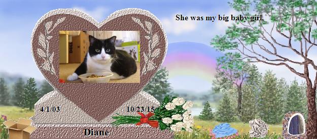 Diane was brought to the shelter in May of 2004. I first saw her in September, after having lost my kitty, Boots, my companion of 16.5 years. I was heart-broken over the loss and would start crying every time I passed by the kitties in the windows of the shelter. I looked at all of them, I just couldn't help myself. I put my hand up on the glass, and Diane looked up at me and promptly put her own paw up to match me! I had to have her! She was the one!! When the adoption counselor brought her out to meet me, I sat down on the floor and she ran right over to me, a purr-box of love. I applied for her adoption and took her home that same day. What Boots taught me, and meant to me, was something I never thought could be repaid, but I began volunteering for the cat shelter in October of 2004, in her honor. I've never looked back. Diane was the most amazing cat. Everyone she met, she took an instant liking to. I never saw a cat who literally liked everyone. All the cats I knew up until then would favor their pet-mom or pet-dad, sometimes both, but never strangers. Diane would wander over and lay at their feet, and would wait to be petted, not pushy, just mellow. She liked other cats too. Not just tolerated them, but really enjoyed being around them. Diane was an only cat from September of 2004, until a neighbor took me to see this stray cat in April 2005. This cat hissed at everybody...except my neighbor and me. She plopped herself down on the sidewalk and rolled over for belly rubs. Well, how could I resist? But how would Diane react? I was going on vacation in a week, and my neighbor was cat-sitting Diane. It would be 2 weeks until I could bring the stray to the vet. If she had any diseases, I didn't want her to make Diane sick. Luckily, I had a long hallway where I could keep them separated until I got home from vacation. When I got home, I got another surprise...Diane and the "new" cat, now, Maggie, were best buds!! Maggie had knocked down the pet-gate and made herself at home. (I only took Maggie to help find her a home, not to keep her...the best laid plans.....need I say more?) And that was just the start. After Maggie, I volunteered to "foster" Sadie, in May of 2006. That went well, so well, I couldn't give Sadie up. I officially adopted her from the shelter on September 30, 2006, passing away in January of this year. (You'll see her memorial linked below, and her story.) But Diane was just so happy to have Sadie become a part of our household. There was never any hissing or discontent, Diane just had the attitude of the more, the merrier. Then I was a foster mom failure for Chi Chi. Yep, I kept her too, adopting her May 2007. (You'll also find her memorial linked below.) And Diane welcomed Chi Chi to the household. Diane's special pal was Sadie tho', and Maggie found Chi Chi to be her best bud. All was a happy state.... Then Chi Chi passed away, after a brief battle with cancer in August 2010. I felt so bad that I could only give this older tabby girl 3 years. I could see all nine of her lives in her eyes. She had so much soul in her eyes. In December 2010, another brown tabby came into the shelter. My heart was captivated. With the craziness of the holidays, I waited until January of 2011 to bring home Zoey. Diane liked her too. How lucky can any pet-mom be with a cat as sweet as Diane? Diane was like the mom-cat, grooming Sadie, and to a lesser extent, Zoey. I can only imagine that Diane is at the Rainbow Bridge, grooming Sadie, licking her face, her ears, and all over her head, as they are re-united once again. I came home on this day to find Diane had passed away sometime during the day, while I had been at work. She had exhibited absolutely no symptoms of distress. She had been peeing and pooping and eating regularly. This morning, she came into the bathroom as was her habit to get first scritchies of the day. She ate her breakfast and wandered off in her mellow way to snooze on her bed. What a shock it was to me. It left me so stunned that I barely had the brain cells to call the vet, and arrange a cremation. I'll pick her up the week after next, and she'll join Sadie and Chi Chi in the memorial "garden" I have where all their ashes are. I know I will never meet another cat like Diane. All cats have their own distinct personalities, but Diane was truly a rare gem in her own special way. I will miss her dearly |