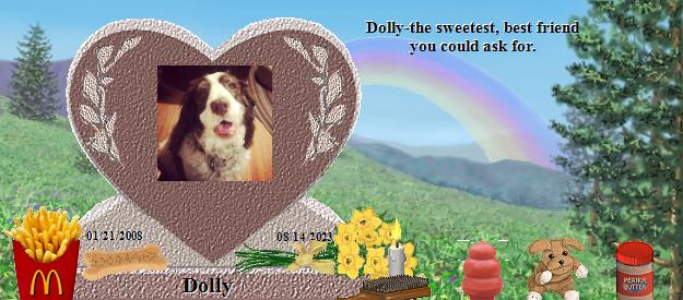 Dolly was the greatest dog there ever was. She was sweet and gentle, yet sassy and full of attitude. Even at age 16, she had attitude! She loved hiking on her favorite trail, chasing chipmunks, doing zoomies, following her mommy around and of course, eating. Her favorite things to eat were french fries, spaghetti noodles, vanilla ice cream and peanut butter kongs. She had more personality than most people do, and there was never a dull moment with her. She brought us so much laughter, joy and love. Her unconditional love and smile was the best there could ever be. She loved playing with her 70+ toys, especially her lambies. To say she was spoiled was an understatement! She loved her family so much that she tried to hold on as long as she could. She was a one-of-a-kind puppy and as unique as they come. There will never be another dog like Dolly. Dolly, you are so loved and so missed. We haven't stopped crying since you left us, but we know you are no longer in pain and you are running free and playing with other puppies. You will forever be in our hearts, and please come visit us a lot! Our love for you couldn't be stronger. Thank you for 16 years of love, laughter, joy, kisses, hugs and just being you. You were such a good girl, boo-boo. Run free now. 8/21/23: It's been one week since you entered the Rainbow Bridge and it's been the worst pain for us here. We still cry and can't even go into certain parts of the house because it's just so hard not seeing you running around. Your little beds are right where they were when you were here. I know you're pain-free and happy where you are but we're empty here. Thank you for all the signs you've been giving us--please keep sending more. We miss you so much, sweetie. Love you to pieces. 8/29/23: We're picking up your ashes today. I don't think I'm strong enough to do this, but we want to bring you home. We're going to take you on your favorite trail for a walk one last time. I have so much regret not taking you there on your last day. I'm sorry, Dolly. This day is going to be so hard and painful; please send your kisses to us today. You left such a hole in our hearts and our lives. I'd give anything to hold you again. Love you, sweetie. 9/14/23: Dolly, I felt you running over to me when I opened the cupboard today, where your treats were. I can picture you standing there so excited for some treats. I can picture you everywhere. Clumps of your fur are showing up all over the house and I know that's you still here with us. Whenever I come home, I sometimes forget you're not here and I look up at the door thinking you'll be there waiting for us. Then it hurts all over again because I remember you're not going to be there anymore. I just want to hug you and cuddle with you once more. There's a part of me that tells myself you're just at the doggy day spa and you'll be home soon. It's so hard without you, sweet girl. It's perfect weather today; you would have loved it. I would have taken you on your favorite trail for a walk. You are so loved and so missed. 1/9/24: Dolly, Christmas wasn't the same without you. It felt so empty. I felt bad for celebrating because you weren't there. I know you have been visiting us because you have been leaving little signs and reminders all over the house. I still keep thinking about our last day together. I prayed for a miracle to save you, but I know it was your time to go. I still think you're going to walk around the corner any minute. You left such an empty hole in our hearts--I hope you knew how loved you were and always will be. 1/21/24: Today is your birthday. Remember last year when I baked you a puppy birthday cake? You were so excited and couldn't believe it! I hope you know how special you are. Today we had cupcakes to celebrate you. I wish I could have given you one. I hope you're celebrating up there with all of the other pets and you're having so much fun. Love and miss you so much, boo boo. |