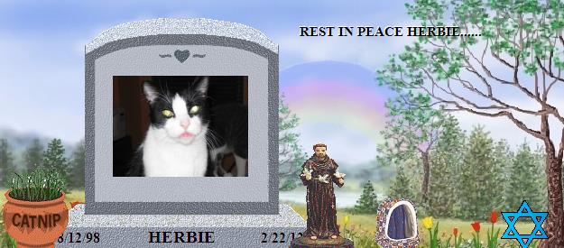Herbie was with us for the last 11 years.......He was one amazing cat........ He will be be missed terribly........ His presence will always live on in our heart....He will always be missed..........Feb.26th...2012 Today is Sunday and you are now gone from me for 4 days........I still can't beleive it...... My life is now so different without you....... Feb. 26th...2012- Herbie, do you remember that first day i saw you? From the moment we laid eyes on each other, we knew it would be a love like no other.....The bond we had was like no other... It always amazed me how you would sit and stare at me for hours every day.......When i asked the vet, what that means when a cat just sits and stares like that for hours, his answer was "He is fascinated with you"..... You can never be replaced..... When you left me, you took a piece of my heart with you...... I miss and love you so much my baby........ Feb. 27th, 2012..... My Dearest Herbie: I called Dr. Luger today to find out that you had left their office to make it up to Hartsdale....... They are preparing you for your trip back to me for which i cannot wait....... Hurry home to me.....I love you so much....... Feb. 28, 2012...... My Dearest Herbie: I called Hartsdale today, to check to see if you arrived safely....... They told me you did, which made me feel so much better. I will have you back with me in 6 days where you belong...... Feb. 29th. 2012 My Dearest Herbie: 11 years ago, when Annie passed away, and i was left alone with Winston, i was feeling exactly the way i am feeling right now with you gone from me. So, i felt her loss, and felt Winston needed a friend, and you came along and entered my heart...... And, once again, the house felt whole again, and i felt so much better that you were here.... NOW, you are gone,and once again, i feel that terrible loss, and void the size of the earth.......Once again, the house feels empty without you here and Mo misses you here with him...... SO, i know you want us all here to be happy, so i went to look for a new friend for Mo, and to help my broken heart.... I came across a nice new kitty....This time a girl........I won't know if i have her for a few more days......