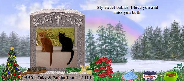 I have never come home that you weren't there for me, two precious faces in the window waiting for me to give some lovin' and some food, in that order. Inky, my sweet girl, you were a dumpster cat that I saved and took inside my home and loved you dearly for 15+ years. You were the sweetest cat, full of love and purrs and goodness, but you grew old and sick and Mommy had to say goodbye. It was the saddest day of my life. But I still had my beloved Bubba Lou, my big, scaredy-cat Orange Tabby, comforting me in our loss. My precious Bubba Lou, two weeks after our Inky left us, you were in the kitchen with me, happy and peaceful, then suddenly, in the blink of an eye, you had a stroke, You were in my arms, and I was crying, holding you, comforting you, and you were gone, suddenly lying there so still. You were gone from me, my Love. You had been with me almost 14 years and you were suddenly gone. You had slept in bed with me since you were five weeks old. How can I get over you? I love you both, my sweet babies, and we will meet again on the rainbow bridge. What a happy, wonderful day that will be, but until then, dear Angels, I will look to the Heavens to see your smiling spirits. I know that's where you both are. 7/7/11 Hi, babies. I am OK but still missing you so very much. My house is so empty without you two. Your little boxes of ashes are on the dresser, as you know, so I'm still getting dressed every morning talking to you. Somehow, those boxes occasionally move on their own... are you sending angel signs to me? Yes you are. I feel them and they feel so good. I love you, my two little bright lights. Shine your love down on me all the time. And play happy in the meadow. Don't hiss at anyone! Your momma will see you when it's time. 2/4/12 Precious babies, it's been a year now. I miss you both so very much but I know that your are happy and well and watching over me. I know I'll see you again someday, it's just that sometimes the sorrow comes back and my heart begins to cry. Today, the sorrow is back. Wish I could hold you both just one more time.... Someday, sweet little ones, we'll just have to wait.