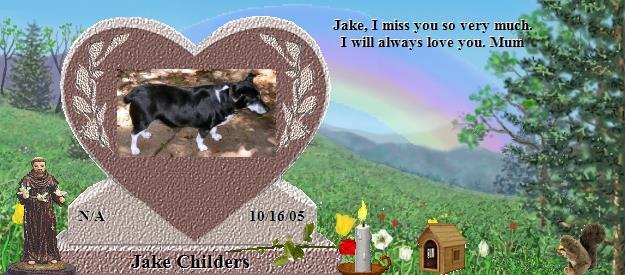 Dear Jake, November 24, 2009 Happy Thanksgiving Little Man and Thank You for coming into my life. I miss you. Luv, Mum Dearest Jake, Dec.24th, 2009 It is with a sad heart I write to you tonight. Whiskers, Violets brother, has been missing since Dec 15th. I have no idea what happened to him. I hope you and the family can see if he has crossed the bridge. Please let me know. Tomorrow night is the Memorial dinner for Tatiana. If you can help in anyway, please do. It was really cold last week and I needed to put out another warmer for Shadow and McGregor. I finally removed your heated bed from its place and gave it to Shadow and McGregor. I just know you won't mind. I love you and miss you sweet boy. Merry Christmas to All. Love Mum Dear Jake, Nov 5, 2010 Please go to the gate tonight and welcome "Prof" He lived at the home of the Sunshine kids. He is blind in one eye and as he was attacked by a hawk. I know you loved to chase squirrels but this little fella is family and you need to take care of him. He comes from the Sunshine Family home and they loved him so. RIP Little "Prof". I just know Jake and all the family will take care of you. Thank you Jake. Luv, Mum Dear Jake,Nov 6th 2010 I have added a pix of the baby Squirrel I sent home this spring. Please make sure he finds Prof and they will be best friends. Thanks again, Jake oxoxox :-) Luv, Mum Dearest Jake, Dec 15,2010 Today one year ago was the last day I saw Mr Whiskers. It was a cold day and he was talking to me near the magnolia bush. I wish I had listened. I waited for him every day, but knew he would not be back. I pray he is with you and his brother Violet and Tigger. Perhaps he has also found his Mother Scruffy, who left after she knew they had a good home while they were still small children. I love you ONE AND ALL. Dear Jake, December 2010 I added a pix of Sadie, who is Mittens kitty sister. Sadie died of cancer and Mittens was very ill for some time They lived in New York and were being cared for by a very nice lady. These sweet cats are now well and healthy and happy. Each, never the less, has one thing in common. They all have someone below who misses them and are so glad they touched their lives. Please welcome them Jake, into our extended Bridge Family. Love, Mum A POEM FOR SADIE ~ THE CALICO CAT 2-18-2010 Miss Sadie Katchmer BY: Gloria Jean Childers http://jpgmag.com/photos/2314454 Christmas 2010 ~ Luke Chapter 2 verse 8-11 May you have a very special Christmas. LOVE From Mum and all my Animals here and beyond the bridge. Dear Faithful Jake, Sept-22-2011 Earlier tonight I saved a baby raccoon fm busy Azalea road. I got a cage from next door and hoped he would be OK till I could take him to the Environmental at first light. That was not to be. I was with him when he took his last breath around 11:15 tonight. Just a baby. I think he had a broken leg or hip. He was not meant to be with me Jake. He was meant to come and live with you and the rest of the kids. Please meet him at the gate tonight or early AM. He may be limping so help him along. Please give him some warm milk,and a warm blanket. Thank you Jake. I always know you will be there to help me. Love Mum. :-( Dearest Jake, May 3, 2012 Please gather the family together tonight and pray for Cinders little boy Oliver. He is going to have a tumor removed from his mouth in the morning. Pray for him and be a comfort to Mama Cinder. Thank You Jake. xoxox Dearest Jake, 10-14-2011 Sunday the 16th will be your 6th Homecoming Anniversary. I can't believe its been 6 years since you left me. I cried all the way to the Vet and all the way home. You touched my heart with your bravery through your illness. May all your friend's attend and may you have a wonderful celebration. One day I will meet you. Until then, enjoy your days beyond the Bridge and know I think about you. You were a good boy. Love Always , Mum Dear Jake,January 10, 2013 Tonight please go to the gate tonight and look for a little white rabbit. My neighbor, next door has been feeding him at the nursing home where her mother stayed for five years. Today, when she went to feed him, he had passed on. His name is Gordie.He is all white and has beautiful pink eyes. Tell him who you are and where you lived and you know his caretaker. He will be very glad to know these things. She is very upset she did not even get to tell him Good-bye. Spring will be here soon. Please have Jenny make sure he is comfortable. Thank You Dear Jake. Remind Gordie how much he will be missed. He will be a wonderful family member. xox Mum Your Picture is in the WONDERFUL video on You Tube.. Jake @ 2 minutes 35 seconds http://www.youtube.com/watch?v=YqCZ79_KeSY&feature=fvsr Please also visit Barney Bush, Cinder Childers, Cricket Childers, Jenny Ryan, Maliaka, Mama Cat Childers, Tatiana, Vumilia and Yesterdays' Kittens.