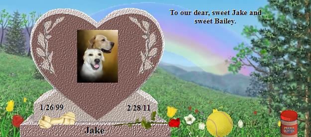 Jake, my precious, lovely boy. How I had eagerly anticipated your arrival! When Dad pulled up in the driveway with you, I was breathless with excitement. You were the most beautiful little four month old bouncing baby boy I had ever seen. We have laughed so many times about our plans to keep you in a nice little kennel, and you would have none of it! So, in the house you came, and right beside me you slept all the nights that God allowed us to keep you. Where did the twelve years go? In those short years, you taught us what life is really all about. You taught us about love, giving, forgiving, loyalty and compassion. What if the whole world could love like you loved? I always called you my little free spirit. I shall now give Dad some space to talk with you. I love you, my Jake, and will count the days until we see you again. Love, Mom Hey my "Jakester", I am crying so much right now this may not make any sense, but I had to tell you I LOVE YOU with all my heart, body, and soul. Jake, I cannot find words to tell you how much I miss you. It's worse than anything I have ever experienced in my 67 years of life. Jake, I had never known what unconditional love was, until I got you. I always realized that you were created by Jesus. Jake, I need to go now. I am crying so hard, but will return soon. I LOVE YOU, Jake. Dad April 21st, 2011 A Dog for Jesus I wish someone had given Jesus a dog As our Lord grew to manhood His faithful dog It is sad to remember that Christ went away And when Jesus rose on that Easter morn Well, the Lord has a dog now, I just sent Him mine Written by Rudyard Kipling 3/14/11 Dear sweet Jakester: It has now been two weeks since you left the earth. Dad and I are having a very hard time with this--you and Dad were inseparable during the day. When I came home from work, though, you were "my baby boy". When I sit down on the couch to read or watch TV, you should be there on one of your many beds, at my feet. How I miss touching those silky ears and looking into your eyes, which spoke volumes. Eyes of pure love. I miss going to the fridge and not having you wedge your way in (one time you swiped a piece of sausage off the plate on the bottom shelf). The house is way too empty now. I know you want us to move on, however, and we will. Just wish you were there, too...... April 28, 2011 My sweet, precious boy, today marks the second month that you have been gone from our lives here on this earth. It has been incredibly hard. We have experienced so many emotions........sadness, grief, sense of loss of a best friend, even anger and confusion. On the other hand, when we see your picture pop up on the computer (we took so many pics of our sweet boy) we experience pure joy at just seeing your pretty face. So many wonderful memories, so many good times, so much love you gave us. Are you settling in at the bridge and enjoying all your new friends? Please tell dear little Molly hello and we love her so much too. We will see you again, but in the meantime, keep sending thoughts of love to Dad and me. Love, Mom May 28, 2011 Good morning my darling boy, well another month has gone by since you left that huge hole in our hearts. We have been broken; fractured. I felt like someone had dropped me in a deep, very dark forest, and I was trying to find my way out...back into the sun(son)shine. But I know you and Jesus have been right there all the time.....and you know we made the decision to get another little furball. In fact, you left him a present; one of your favorite things in the world---a tennis ball, slightly used, well loved, with your yellow hairs on it. Dad found it under the dresser when he was vacuuming yesterday....he had vacuumed that spot a hundred times and the ball had never appeared before........ I know you would love and approve of Bailey. The lady we are getting him from told us when she went into her bathroom, there were rainbows all over the mirror and white tile in her bath...light that came from the crystals in the bedroom window. She said that had nevered happened before..... My sweet, beautiful Jake, just know that you are one of the most loved that ever walked the earth. We cherish the memories. Father's Day--June 19, 2011 June 28, 2011 July 11th, 2011 July 28, 2011: Hi Jake, sweet dog of mine....today is five months since you left us. When I came in to write to you, the pictures on the computer were of your last day here with us. You still loved your tennis ball and you smiled at me from the front yard. Sometimes little Bailey has the same expression on his face that I saw so many times from you. You sent us a good little boy. Thank you. We love you........ August 28, 2011: Good morning sweet Jake. I know you are doing better than anyone could imagine, so no need to ask how you are. How quickly six months go by.....we miss you as much now as we did at first, but we know you are happy at the bridge with all your friends. Bailey is growing and he is a wonderful puppy...six months old on August 13th. He has a lot of your characteristics, and we love him. Have fun today...we dearly love and miss you. September 28, 2011: Hi Jakester, has it really been seven months? Sometimes it seems a lifetime. Tell me what you did today at the Bridge. Probably played with your tennis ball. How many cats did you chase? Did you run with the squirrels and fly with the birds? The weather is always perfect where you are--not too hot and not too cool--just right. Bailey is beginning to remind us more and more of you--do I see you smiling? Oh, he will never fill your pawprints, but he is a great little short legged fur baby. He really is good in the house. He is a little hard-headed, like you. Don't look so surprised. You know we love you more than life itself. Sleep well tonight, my darling. Love, Mom October 28, 2011: Hello my darling, how are you today? Just perfect, I know. The weather here today is rainy, windy and cold. You never have that kind of weather where you are--only sunny and 