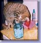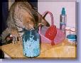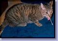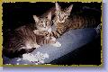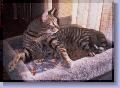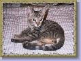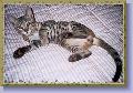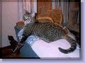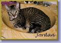 JORDAN'S STORY Jordan was only 8 weeks old when he first came to live with us. I got the bright idea that I could give back to the shelter cats and rescues by fostering and helping to find good and forever homes for the strays and homeless. Jordan was actually my second kitty to foster and went through the usual routine things like taking him for all of his shots and getting him to the adoptathons so we could begin looking for a forever home for him. It was during those times that our special "luff and cuddles" were born. You see Jordan was found with 3 siblings by some boys in a field behind their home so Jordan was what you call a feral kitty boy and he lived up to that name for sure. He was pretty wild and everything spooked my little guy. But it didn't take him that long to learn to trust me--but anyone else?? that was another story! So when I had to take him to the adoptathons he hated it and wouldn't even look at people let alone let them touch him. So I learned to just hold on to him tight against me and it would calm him down. He was so small then that he would crawl way up as far as he could go to under my neck and just nuzzle there hiding his nose under my chin. Thus were born our "luff and cuddles!" Of course that didn't sit well with the people who ran the group because they wanted him to be adopted and more than once I had words with them about it. I was not going to force him to go to people he didn't want to. Long story short, that was the end of our fostering and Jordan became an official member of the Potter household and our lives were forever blessed by the joy and love he brought into it. Much to my 3 girls dismay who were about 6 years old--you could say he rocked their world! Zena, Scraps and Neek were playful and perky but not a dynamo like their baby brother Jordan! Jordan tried his best to get his sisters involved in his antics and playfulness but usually was the one who ended up with "egg" on his face so to speak! He was so mischevious and sneeky but always had this "who me?" innocent look about him. At times he would antagonize the girls and I would have to reprimand him. But all he had to do was look at you with those greem eyes and you had to smile or even laugh and couldn't be mad at him! I always told him he was the best "suck up" I had ever seen. He would know if he had done too much or was in trouble. He would come up to me usually on the couch and just inch his way closer and closer looking up at you as he moved along--who could resist that face?? I never found out how to do that! Of course then he would proceed to the "luff and cuddle" phase and I was a goner. Imagine too by this time Jordan is a big healthy boy weighing in at 10 - 11 pounds and yes he is still trying to fit up as close as he can up to my neck for luff and cuddles! Jordan loved Q-tips! Yes, even dirty ones--blah.... I always had to be careful when I used Q-tips to either flush them down the toilet or put them in the bottom of the trash. But sometimes that didn't stop him. He would dig all thru the little trash can in the bathroom to get to them and I would come home and chewed Q-tip parts would be strown thru the hallway! One of Jordan's favorite places was the top of the cat tree where he could see everything that was going on and use it as a rocket launch! Jordan loved his belly rubbed and would just roll over for one anytime! He was beautiful with his dark black stripes on gray and on his underside he had shades of brown in his fur. He also slept with me on the side of the bed where I could put my arm around him and he always had to have his head right up against my face. Jordan was a robust, healthy boy until just a month or so before we had to say good-bye. I had thought I noticed one side of his neck being a little more puffy than the other but then I would look again and think I must be imagining it. It was during a time when my daughter and kids visited for about a week and most of the time Jordan stayed under the bed. This really wasn't unusual because even though Jordan loved me he never lost all of his feral nature and would hide when strangers were around. Even if you saw him pretty often he was leery. Then I had the carpets cleaned so again under the bed. After a few weeks and all that was over, Jordan came out like his usual self. But by this time I could tell that the side of his neck had gotten much more swollen. So off we went to the vet. Dr. Melchoirs took one look and said he was afraid for Jordan. He took him to the back, did a biopsy on the spot and found my boy had a very aggressive sarcoma. It was in such a place that he said it was probably all wrapped around cartilege or bone and there would be no chance of getting it. Chemo was not an option which I wouldn't have considered anyway. So I was told to take my boy home and enjoy the time we had left. It was one month to the day of Jordan's diagnosis that I lost him to be the biggest evil named cancer....slowly off to peaceful sleep as we shared our last "luff and cuddles."...sniff But Jordan's memory lives on and his feisty, playful spirit will always be a source of joy to my heart. Run free my sweet boy, stay close to Bo and one day we will all meet again. (along with Dusty, Coco, Sydney and Boots.) Love, Mommy ___________________________________________________________________________________