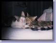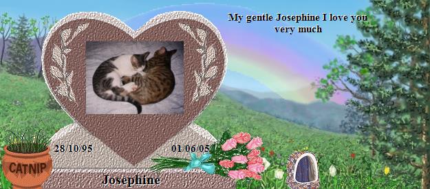 | Well this morning I had to take you to the vet to get your needle and I still cannot believe that you are gone. You still looked pretty healthy and only started to get sick a few weeks ago. Unfortunately they found cancer right through your body and thats why you were not eating because it was making you feel sick and you couldnt do toilets. Now I have lost my two grey and white cats that have lived with me for over 8 years. I still havent got over losing Simba in January and now you have gone. I will add more to this and your picture but this will have to do for now. Well its the 7th of June and I have just added your picture I hope it is ok as most of your pictures are with Alexander its impossible to find one with you two separate so I have cropped this one. I am really not coping at all this time I dont know how much longer I can just go on like this. Now I am wondering if you were really sick and should I have just taken you home and that you may have got better. How can I believe it when they say your body has cancer all through it???? You looked so well I know you couldnt eat or do toilets but in time you may have. I cannot believe I will never feel your beautiful soft thick coat again. You were so helpful to me when Simba died and gave me you love and company so now what do I do???? Poor Alexander doesnt have a clue whats gone on and I dont think he can see photos or understand them. As far as I am concerned my life has changed forever and I cannot see I will feel the happiness I felt before you and Simba left me. There is this constant ache and at the moment I break down and cry at the slightest thing. I will keep in touch. Oh bye the way thankyou for the beautiful rainbow in the sky on Thursday the day after I had you put down. It was so large and bright and and a small little line of colours that just lay at the end of the rainbow. I am sure it was a sign that you had arrived at rainbowbridge and I hope Simba was there to meet you. Is Simba ok??? tell him I cry for him as well. Lots more to tell you but not now love you both. Hello my lovely Josephine my special good gentle girl. There has been so much that has happened as you may be away but the main thing is poor Alexander is not coping too well he misses you mostly and Simba and also he is very mean to the other cats Christobelle and Snowflake. I know you didnt know Snowflake but she was keen to be part of our family when we had just moved and while you were inside the house and not well. You were so kind and gentle to Christobelle and I wonder if you had not had cancer then you would have been Christobelles friend and she may have been a more friendly cat. Not sure how Alexander would have reacted as he is not happy with the cats at all and has attacked them. He is not very well either and I am scared he will leave me soon. I couldnt handle it really but its amazing how much affection he loves from me now he is the only cat left out of the three of you. He does rely on me a lot but I know if he could make friends with the girls he would be alot happier. If there is anything that you can do maybe come into his dreams and suggest this to him we could try it. I have to be so careful because I dont want any of them hurt. Its no fair on the girls and Alexander could get himself hurt as well. the silly sausage that he is. I must go for now take care I love it when you are in my dreams keep coming into them stay close to your tiger and send him lots of love. love you so much my beautiful gentle Josephine Your devoted human mother. Hello Josephine its been a long time since I contacted you but I have been so very busy and I think you know why all the cats being unwell and dramas at home. Well as you know on Wednesday at about 8.30am Alexander needed the final needle to take him away to sleep for good. I am devistated as now all three of my boys are gone. I know you would have been next to him for quite a while anyway but especially at the vets that day when he went. You and Simba would have been there to lick and kiss and cuddle him and take him with you both and show him what to do and what has happened to him. I miss him so much as we cuddled up in bed together every night since you went away and its been five and half years. But of course my time has been occupied taking care of Snowflake because I thought she was so sick and wouldnt be long in this world. Her opperation was a success so far and is quite happy playing outside. But I did spend many nights and a lot of time with her and I had to leave Alexander by himself my special baby my tiger cub all alone. He didnt like that at all. Anyway I will place a residency for him later as I am just at the library with no email access and I have already written pages at home as what happened. But should really construct a story about him including his time with you and Simba plus his time when you had passed away. I miss him so much he loved nothing more than to be with me either sitting on my lap or being in bed with me as long as I was with him. He died of something quite horrible and I think he did suffer for a about 3 days too many but he isnt suffering now. I feel life will never be the same and of course it will not be. I will take care of Christobelle and Snowflake and love them too but my heart aches and there is a sadness for you and Simba even now so it has increased with the loss of my Alexander. Take care Josephine I know you are now taking care of Alexander he always followed you everywhere and really loved you so much he never got over losing you and he wondered where you went to. Please all three of you come to me in my dreams as I am so lonely and missing him I am missing him so much I cannot sleep at night and nothing helps me at the moment. I will find a lovely photo of the two of you together and maybe one of you and Simba and Alexander in our very happy days when we didnt have any of this sadness thats keeps just being added to without any relief. Watch over us 