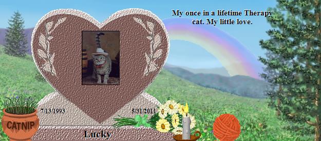 5/31/11 Today we released you to go to Rainbow Bridge. It was time. You spent your entire life, over 17 1/2 years, as the most unique and wonderful Registered Therapy Cat one could have ever imagined. You started at one nursing home and went on to visit many more, become part of a dance drill team, dancing to "Alley Cat", doing hospice work and making a huge difference for one special resident, working in a hospital setting, educating people on what a therapy cat does, winning a calender photo contest and allowing me to dress you in all sorts of outfits without protest. Your favoite toys were all kinds of ribbons and the special catnip toys we made for you. You would go anywhere with me and when we arrived back home you loved to walk on your leash as we went back to the house and explore the grass and the cars parked in the cove. You loved sitting on the fleece bed on top of your rolling crate to viisit residents. You were so patient when I put your special nail caps on before visits. Even when you were diagnosed with diabetes and had to have daily blood glucose tests you easily allowed this and adapted to a new low carb diet. These last few months, when it was discovered that you also had cancer you put up with the feeding tube which helped keep you going and even the IV fluids you needed at the end. You even hung in there for a final mini photo/video session and continued to eat on your own until the end. All those costumes lent themselves well when you needed the little undershirts to help protect your feeding tube these last few months. All the time we spent together while caring for you in your own hospice situation during the last few months just brought us closer together. You are so much missed and loved. You are in a better place now, but we will visit with you often. You are with Misty and Max and Samantha Jane now and they will welcome you and show you the ropes. I will be working on a very special urn for your earthly remains and put lots of love into it. Rest in peace. We will miss you so much. Today a huge basket of azaelias arrived from your friends from Love On A Leash, with a huge blue bow and a dove. I will try to plant them so they come up every year in your memory, and keep the bow and the dove. Love for now from your people and from Daisy and Emmie. Your Mother and Father Please also visit Colorado Mist, Daisy, Max and Samantha Jane. |