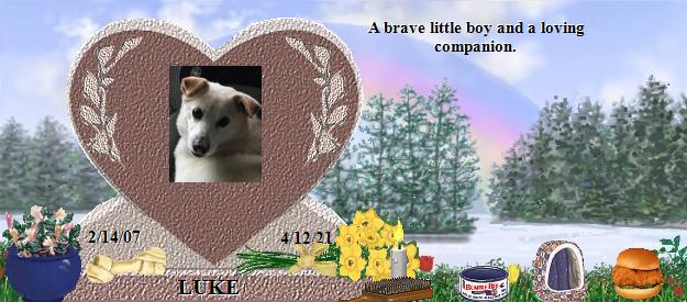 Hey Luke my God has it been three years? Well as you know your buddy Harley joined you last December and that also broke our hearts but we knew that Harley was going to be warmly welcomed by you. We think of you often because of your sweetness and also your fight those last months. I look at the video of you trudging around the snow and I am so proud of you and miss you so. Please take care and say hi to Harley, Sam, Jake, Lucky and all the rest. We love and miss you Dad Hey Luke four years gone so sad. I know you and Harley are hanging out together and I bet you were glad when he arrived. You two were such a precious pair and we miss you both so much. I see your pictures every day and remember your smiles. We have a new guy named Beau and he is also precious and such a cuddler and a barker. Nevertheless we miss you so much and send you love from this side of the rainbow bridge and know that we will be ready to greet you when we head your way. We love and miss you Dad Please also visit Jake, Lucky and Sam (Samwise). |