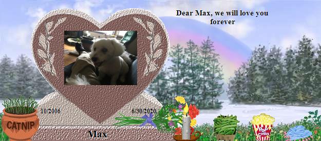 Max was the most gentle soul I've ever met.His kisses were gentle and it was like he thought about them first. I miss you, you little goober! Well, it's been a long six months since you passed Max. We still miss you every day. We hope you are in a peaceful place until we meet again. All our love Max! It's hard to believe we have been without you for three years. We think about you every day. Missy and Moe are with you now, life seems so empty. I hope the three of you are running and playing until I see you all again..... |