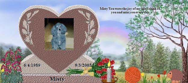 Misty had the softest tummy, and I was always nuzzling her. The dearest thing she would do was put her paws on the side of my face and look in my face like she was saying "Don't, Mommy!" and then I'd always get a kiss on my nose! We always had our special time, right before bedtime. I would lie on the floor beside her pillow and we would talk, nuzzle and love. That was how we ended each day. Misty loved to go for a ride, but she always wanted to drive! She became familiar enough with roads that she knew when we made a particular turn it would lead to a Tastee Freeze or Dairy Queen. And she would get some ice cream. She could count, too; she knew it was Daddy first, then Mommy, and then Misty. And sometimes when Daddy lost count she knew and let us know with a soft whimper. What a joy she was; 16 years was not nearly long enough. Today marks 13 years since she crossed the Rainbow Bridge - and it isn't any easier without her. But now her Daddy has joined her over the Rainbow Bridge; I know she was glad to greet him! And now all four of my fur babies are together with that Daddy. And waiting for me. It won't be long now, just a few more months. Wait for me, I'm coming soon. Misty- this is your Mommy's step daughter writing to you. Your Mommy is coming to see you. Wait for her at the water's edge, she will be there looking for you. She loves you so much and can't wait to see you. We will miss her so very much but I know she will be so happy to get you in her arms. |