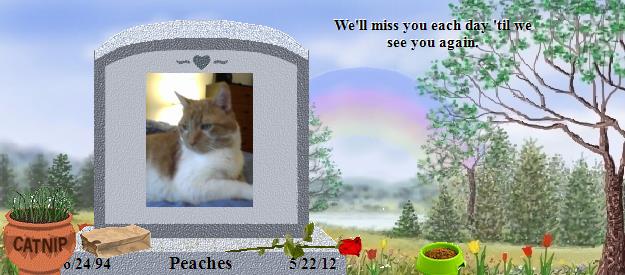 Wednesday, May 22, 2013...We remember you today, Peachey, with all the love in my heart that I still can muster since you left us for the Rainbows Bridge one year ago today. We miss you so much: It's much too quiet here without you nearby. I still often hope I'll see you when I come through the door at home at the end of the day; but alas, I know you have much more to do with your new friends--and wonderful friends I am sure they must be. All ANGELS, just as you are. I want you to know I have a candle lit for you at this moment; I do this almost every day in remembrance of you. I miss having you jump up on to the recliner with me so you can settle in for a nap. I cherish that time. It was nice to know you appreciated being with me...even a little bit. I know Jon, Sarah, and their mom miss you, too. Your spirit will remain with each of us until we see you again. We'll always love you...Our best friend. Have a great run in the meadow, Peachey. Monday, June 24, 2013...HAPPY BIRTHDAY, Peach!! I've been thinking about you all day and wish so much I could pick you up and hold you. I miss the feeling of your soft fur. I just want to tell you I LOVE YOU. Home isn't really HOME without you here...But I carry on as best I can. Until we see you and hold you once again, remember we all miss your company and love you with all our hearts. Your spirit is ALWAYS with us. Happy birthday! Tuesday, October 22, 2013...It's been 74 weeks, now, since I had to let you go into God's loving world, Peachey. I miss you very, very much today. I'm home, alone, without you nearby, and it's much too quiet here. I try to remember you every Tuesday at this hour when I had to say "Good Bye" and I still feel so sad. (As I write this to you I was holding you in my arms the day I had to let you go and telling you how much we ALL loved you and how LUCKY we were to have you with us. You were so brave. I'm sure you knew it was time to go...) I hope you can see the light from the candle I have lit at this moment in remembrance of you. You are the light that still shines in our hearts each and every day. A light that STILL SHINES SO SO BRIGHT! I can only imagine how beautiful the meadow by the Rainbow Bridge must be. I hope to greet you there some day...Until then "PEACE" my wonderful friend. Thoughts of you are cherished. I know you are never too far away. The beautiful seasons are changing once again...I wish you were here to see all the bright colours. It's a special time of year and it reminds me of you each and every day and how lucky we were to have you in our lives. Peachey's Place is full of heartfelt memories today and ALWAYS. Monday, April 21, 2014...Yesterday was Easter Sunday, Peachey, and I had you in my mind and heart all day. I still miss you so...Home isn't the same as it once was without you here: How I long for the old days when you would jump up on the recliner to share your time and space with me. I always loved that...to feel your soft fur and warmth right next to me. I just wanted you to know I think of you and miss you every day. Until we all get to hold you again: Peace... and have a wonderful time by the Rainbow Bridge. We ALL LOVE YOU!!! Thursday, May 22, 2014...I'm home, alone, with so many cherished thoughts of you right now, Peaches. At the moment in time as I write this to you, I was holding you in my arms two years ago so afraid to let you go. "What will I do now?" I silently asked myself. I realized you were probably very confused what with the mental state you must have been in; and also accepting the fact that it was time for you to depart this world we shared for God's universe as his newest "Angel Pet". The days and the seasons are flying by...and I know when I come home from work each day that I won't find you waiting here for me...to share more time together and watch those seasons beautifully change before our eyes. I feel so very sad and alone...I miss your company with all my heart. I hope you understand it's so hard to let go. I know you are just fine making new friends and learning from God and his heavenly angels just what it means to live a life that lasts forever...and how to love as HE does. Whenever I see a wild rabbit by chance in the grass as I make my rounds each day, I hope so much I see YOU looking back at me with a reminder that you will ALWAYS be close by. They, too, are precious, gentle creatures I'm always pleased to meet. Just as YOU are. I will hold you in my heart FOREVER, Peachey. PEACE be with you...With LOVE from ALL of us...'Til we meet again...GOD BLESS. Tuesday, June 24, 2014...HAPPY BIRTHDAY, Peach!! I hope you have had a wonderful day in the meadows by The Bridge celebrating with all your angel friends. I bet you are having a great time!! I hope so very much...The days are passing by so quickly; and I miss you all the time. NEVER a day goes by without my thinking of you. We ALL MISS YOU! I wish I could pick you up and tell you I love you. I can with my memories of you snoozing on top of my recliner by my head or just by my side as I watch the television. Simple things, simple times. It hasn't really been home without my best friend close by. Your paw print is still prominent on the floor in the kitchen. I hope it lasts there forever...or as long as I am here. I still have a part of you....PEACE BE WITH YOU...ALWAYS...Love, Dad..."Peaches' Dad" as the people at the "vet" used to call me. That's my favorite name. GOD BLESS YOU, Peaches...HAPPY BIRTHDAY!! Tuesday, January 13, 2015...I hope, so much, EVERY day I come through the door from work, Peachey, that I will find you here waiting for me. Just like the old days...It always feels so empty without my buddy here safely tucked away at home. There's ALWAYS something missing from each of your favorite spots: YOU...It's been a while since I've written, but I haven't forgotten how wonderful it was to have you here. How nice it would be to hold you again. Perhaps someday.....I'll be able to do just that...'Til then, PE