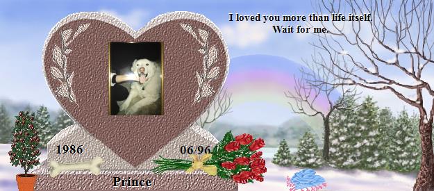 Prince was a giant of a dog in size and in his heart. He always loved me unconditionally. Thank you for coming into my life and for being my best friend. Someday I'll hold you again and never have to say goodbye again! |