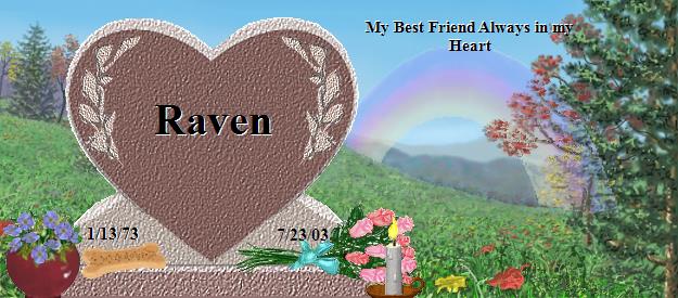 | Raven was a fighter and a truly wonderful pet. He was the dream come true that I had as a little girl and he gave me some of the happiest moments I've ever had in my life. I will never forget him, never stop loving him. Hello Raven. I am missing you more and more all the time. It is almost one year since you left me. Daddy now put your special tape on a DVD for me - so I can watch it whenever I wish. The other day I watched it and cried. You were so beautiful and such a joy to me. I hope you are in a better place now and never have to suffer again. My heart aches for you and I long to dream of you -- you are my very special love. Hello Raven. Mommy is missing you more and more each day. I take walks and cry and wish I could see you once more. Daddy had your video made into a DVD so that I can play it. I watched it on Sat and cried watching you gallop around the corral and then take me for a ride. You were so beautiful - so proud - so awesome under saddle. It will be a year soon that you left me and the aching has not eased up at all. The only thing that helps is to believe that you no longer suffer and that you are watching over me. I hope so. I wish I could snuggle in your neck and kiss your sweet, soft muzzle as I did every day for so many years. Rest easy my beauty. I shall always love you so very much. Hi Raven. It is already September. I am missing you so very terribly all the time. When my birthday came, it was you that I missed most of all. I hope you are watching over me, Raven, as I've had some problems lately and I want to be healthy. I can't believe you are gone for more than a year already. The time has gone so quickly but the memory of you will never fade for me. I think of all the times we shared and remember how much I loved to look out the window and see you in the backyard - to be able to go outside and touch you and give your muzzle a kiss. We had so many years together but somehow it never seemed long enough. Please know that I still love you so much and always will. I can see you in my mind and you are always so deep inside my heart. Sleep peacefully my beautiful boy. Mommy misses you and needs you so much. Hello my darling boy. 2004 is coming to an end - and not soon enough for me. It has been another terrible year - not only because you are gone but now Bandit, your beautiful friend, has cancer and we are fighting to save her. Mommy has not had a good health year either - but I am fighting to get better too. It was so much lovlier when you were with me. I miss you so much - I can hardly bear even seeing other horses anymore. When I wasn't feeling good it was always the best thing to snuggle my face against you - you were always there for me. Mommy and Dad are going away next month for 20 days. We need to get away from here. I'm worried for Bandit, Kahlua and Sofie -- but we need our time away from home too. Please watch over them for me and keep them safe. Mommy loves you with all my heart. There can never be anything or anyone who can fill the void you have left in me. My hugs and kisses go to you right now -- I love you, Raven.Hi my angel. It's been a while since Mommy wrote to you. We were away in Jan for 20 days. It was a wonderful trip. I never stop thinking of you no matter where I am or what I am doing. You are so much a part of me. I think of all the years we had and sometimes I feel like I didn't always do the right thing for you. You were always so brave, so honest and strong. I miss your beauty and your warmth and how it felt to put my face against yours; the smell of your muzzle. It is so hard, Raven, to be without you - yet I know if you were still here I would be frantic each time I go away - each time it rains so much - or gets so hot. I hope you will keep watching over Mom, Dad, Bandit, Kahlua and Sofie. We all miss you so. Please know that there will never be another to take your place. I can only pray that you are in a better place and at peace. So much harm came to you that I could do nothing about and I am so sorry for that. I always tried to give you the best life and hopefully you had that with me. I love you forever and always my beauty. Mommy Hello, my beautiful boy. Mommy had to send Bandit to Rainbow Bridge last week. I hope you are together now - along with Andy, Hershey, Remi, Smoky, Rinty, Golda, Simone and Chaps. I miss all of you so much - but you especially and now Bandit, who was such a wonderful girl and a treasure for the past 9 years. I wonder if Mommy will ever stop crying over you babies?? I try to see you in my mind - with Bandit running along the fence by your side. She loved running with you so much - and I know you enjoyed it too. I miss hugging you and kissing your beautiful muzzle. If only I could have had more time with you. I love you so - and think of you every day. Hello, my darling boy. I've been awhile in writing with all that has been going on - but you are in my mind and heart every day of my life. I miss you so very much. I try to think of our times together and sometimes that makes me so much sadder. It is almost 2 years that you left me and it has not gotten any easier. I hope you are content and that you are watching over me. I love you so, Raven. Always remember that. I see you in the horses I love to watch and I remember how much I loved seeing you in our yard every day. I'll be back to you soon. Hello, my angel. I hope you are doing well. Nothing has changed, I still miss you with all my heart and love you even more. I hope you keep watching over me and protect me whenever you can. You remain my beautiful memory and shall always live in my heart. Hello, my beauty, how are you? Mommy is going away on Fri to Europe. I want you to watch over Daddy and me while we are away from home. I will think of you all the while, as I always do and miss you. It is easier when I am not here where all the memories are - but you are never out of my heart. I love you my boy. Hello my beauty. It is holiday time again and once 