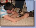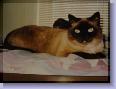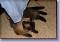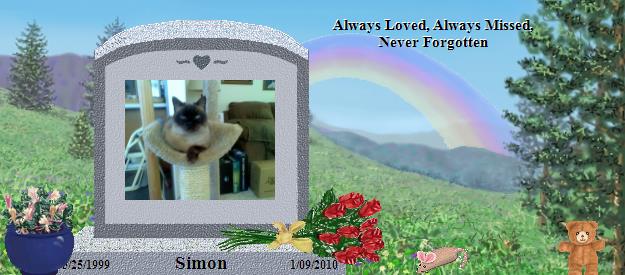 Simon, where to begin. You were such a special kitty and your loss is so new. You fought a valiant fight against a deadly disease. We treasure every extra day we were given with you and hope we spared you some pain at the end. You lived eight months with lymphoma, almost all of them happy times for you and us. You enjoyed your roasted chicken, McDonald's plain hamburgers (sans bun), cat nip, and cat treats. You were always up for a good meal until the very end. I will miss you sleeping in the chair beside me while I am on the computer and I will miss you sleeping beside me at night. I am comforted by the knowledge that you died a peaceful death with the last things you felt and heard were my touch and my voice telling you how much I love you. My hope is that you are now chasing butterflies and leaves in the sunshine that you loved. I hope you have met our other loved pets who have gone before you. I hope you know how loved you were and will be waiting for us when we cross that bridge, too. You will forever be my little "boober boy" and "boy-cat, cat-boy." I love you, Simon! 1/10/2010: Good Morning, Simon. One whole day without you. I can't look at your picture without crying. So many memories of you everywhere. So many people have signed your guestbook and I got flowers from my son in remembrance of you. Life will go on and outwardly, days will come and go as usual. But, it will be awhile before I stop thinking of you and missing you every minute. More memories of the cute things you did keep popping up. Remember the little hat you had (of course, you hated it!) Run and play in the sunshine, Simon, just as a kitty should. Keep those dogs in line, you were always good at that - you were the boss! Thinking of you and loving you always, my little Siameezer! 1/11/2010: Hello, my precious little Siamese guy! We still think of you almost every minute. Being at school today helped, I had to think of other things like students and polynomial functions. However, when I come home, the house seems so empty. It will be more empty tomorrow when Nick returns to college after break. So much of you is everywhere I look: your Christmas toys, your catnip, your medicine. I can't bring myself to put it all away yet, maybe someday in the future. I have an image of you in my mind, all healthy and happy with the other babies there. I hope you are playing nicely, but I know you are. You were such a friendly, loving, sociable cat. Your kitty friend from across the street was here yesterday. I think she was looking for you and wondering where you were. It was such a nice, warm day after all of the sub-zero weather. You would have loved it because you could have been outside in the sun for a little while. Be happy, little Simon, and send warm thoughts our way. Know that we love and miss you all the time, my little "boober boy." 1/12/2010: I had to stop and say "Hi" to you, my little Siamese guy. I don't want you to think we were forgetting because we aren't. Except when I am busy at school, I always have you on my mind. I glance at the chair where you should be but you aren't there. However, I must tell you that your dog bud, Middy, sleeps there more frequently now. A black lab doesn't really resemble you, though! I give Middy her dose of petting and loving and wish I could be sharing that with you, too. I have to believe that you are in a place where you are getting your share of love and cuddles, though. You are quite handsome and hard to resist, you know. We love you, Simon, and are getting more pictures together for your site. Remember how you would lay on the papers I was grading when you thought I'd worked enough and it was time for you? I had to stop and pet you, pick you up, and give you love. You were very adept at getting what you wanted and even had to share Middy's food in the morning. I always had to put 5 small pieces of her kibble on the rug so you could have some, too. You did that right up until the end, also. That was just last week. Hugs and warm cuddles, little Simon, run and play and maybe you will catch that fly this time! I love you and will always miss you. 1/13/2010: Hi, Baby Simon! Couldn't let the day go by without talking to you. Did you see your new pictures? There is one of you as a baby, you were so cute! What a handsome boy you grew into, such soft fur and pretty blue eyes. Have you met our other pets? There's Jade (he's Siamese, like you), and Buster, Jiffy, Misty, White Dog, Gypsy, Duchess, and so many others. We loved them, too. We still think of and miss you all of the time. Some memories do bring a smile to my face, though. Remember when you took a bite of Nick's sugar cookie? I told him you wanted to see what it was and you surprised both of us by chomping off a piece and eating it. That was when I was holding you, too. Who knew cats ate cookies! I don't think you thought of yourself as a cat, though. Stay happy, little guy, and know that much love is always streaming your way and that rainbow should be quite bright now with all of the tears we have shed. We miss you, little Simon! 1/14/2010: Came to say "Good-night" to my best little Siamese Boy. I bet you're tired from all of the running and playing in the sunny meadows with your friends. I hope you are happy and pain free, Simon. We still miss you all of the time. When I came home from work, you were always there when the door opened and wanted outside. I find myself looking for you every time I enter the house. When I look at your pictures, I can see your spirit shining through. You had so much personality and actually had different facial expressions that mirrored your feelings. We love you, Simon, and are trying to concentrate on all of the good memories we have with you. As time passes, it will get easier. We'll never stop missing you, though. 1/15/2010: This is a difficult entry to write, Simon. Last Friday night, a week ago, was the last night you were here. The last night that you slept next to me. It was the night I