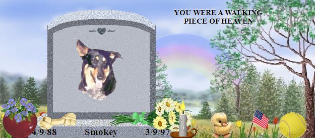 I am sorry I don't come here as often as maybe I should. I am just so sad all the time, and wishing I could be back with you all when times were better. I love you Smokey and always will, even after my death. I sure hope God thinks I am worthy enough to join all of you. Please also visit LADY, Missy, Ms Bo Jangles, Pepper and Scooter. |