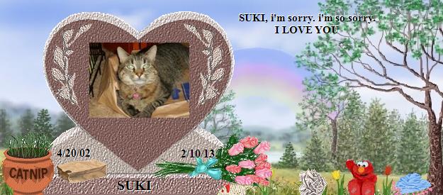 thank you, everybody for the kind words for Suki. she was a little 10# cat. 1/2 Siamese, 1/2 Abyssinian. she was 2 mos. short of her 11 yr. birthday when 2 dogs grabbed her and killed her. one was a pit, the other a cattle dog. she died a horrible death. I didn't find her till next day. I buried her on valentine's day. she was a housecat. she never went outside. I left the door open. on feb. 1st, I had to put my 20 yr. old cat down. I thought I could handle it. something happened. I just wanted to sit and sleep in my recliner. Suki kept trying to get in my lap. I pushed her out. many times. I said leave me alone. or no cat. after putter died, I picked up all his dishes and put them away. and his litter pan. it's a good thing my housemate has a cat. I guess she used his pan or ate his food. I don't remember feeding her after putter died. he would have been 21 yrs. aug. 10th. he was full Abyssinian. I got Suki when he was 10 yrs. old. he made her number 2. she had to sleep by my legs. he slept up by my head. I told her, it will be me and you when he is gone. I think she missed him. she wouldn't leave me alone and I acted like she didn't exist. I think she was mourning him. now, I know she was depressed. she liked to hang out at the sink. the day she was killed, I rinsed my coffee cup and looked at her and thought, her fur looks awful. she is not grooming herself. I never said a word to her or touched her. I walked away. I keep asking God, why? why did she have to be killed? Why didn't You tell me she was outside? she was my sweet talker. meow meow, meow meow meow always at least 5 meows. I took her to the vet when she was 8yrs.old for surgery to save her life. they cut her open from stem to stern. her stomach was full of her hair. she couldn't eat or drink. vet said she would be good for another 8yrs. I feel so bad. I treated her like crap. I ignored her and pushed her away for 9 days. last time I saw her, she was hunched up, like she was cold, about 2 feet from my recliner. I never saw her go out. she probably went right up to the dogs, looking for a friend. I wish I could have a do over. a 2nd chance. I would have picked her up and hugged her. I did when I found her. I hope she knows I love her. i'm so sorry, Suki. if I could get those 9 days back, I would hang on to you and pet you and hold you and protect you. putter and I were best friends for 20 yrs. I just could not handle his death and took it out on suki. i'm so sorry, little girl. my kitten. my princess. I hope you and putter are together. my suki, my baby, my little girl. I found your blue mousie, today. I remember you throwing it in the air and chasing after it. and the sound of the little jingle bell on your other toy used to make you come running. I miss you so much. I totally ignored you and pushed you away and yelled, leave me alone, for 9 days. i'm sorry. i'm so sorry. I LOVE YOU! I created a garden where the dogs attacked you. I planted flowers. all shades of pink. I hung wind chimes. and the place where you died. there are more flowers, an angel and more wind chimes. you are buried next to putter. with pink flowers on your grave. and a solar light with pink tulips to stand guard at night. I hope you are happy where you are. SUKI !! the day putter died was fine until we went to the vet. it was not our regular vet we had for years. he was out of town. the vet tech grabbed him by the back of his neck too rough. she had long nails, digging into his neck. I grabbed her hand and yelled at her, don't hold him so hard ! they gave him the shot and putter started softly meowing. I asked the vet, is he in pain ? he said no, he's talking to you. I lost it. I was crying and telling him I loved him. I told him I would find him in heaven. then he sat up ! I was so shocked, I just starred at him. then, he gently laid himself down, and was gone. my housemate was there, in front of putter. he said they made eye contact. it should have been me ! I was behind him. I wish I had grabbed him and held him in my arms. I wish he had died in my arms. putter came to me in a dream. he said he sat up to see me. he was looking for me. I LOVE YOU, SUKI This is little Cheddar. I bottle fed him and his 3 brothers since they were a day old.His brothers are doing fine but this little guy didn't make it. Please take care of him, Suki. He was a little sweetheart. He will love you and never hurt you. I love you, Suki 💕 We will all be together ♥️ |