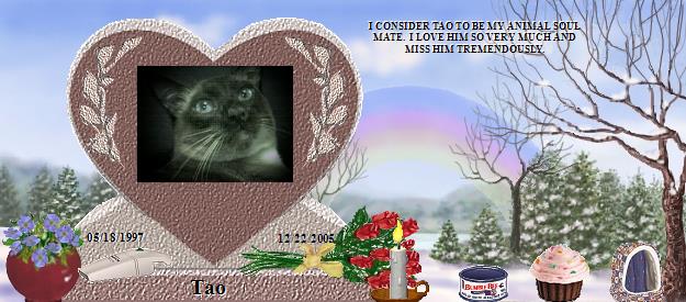 I got Tao along with his brother when my family and I lived in Germany, they were my birthday present one year. From the beginning Tao was a bit afraid of his own shadow, wasn't very socialable. I was bound and determined to make him my cat. Through alot of hard work, it was clear he was my baby. I would say to him lets to watch Buffy, or it could be ER, or anyone of my shows, and he'd follow me into our bedroom jump up on the bed with me and we'd watch tv together. I would leave to go to the store, and when I would get back my family would say, thank God you are home, he wouldn't shut up the entire time you were gone. But the instant I was home, he'd stop meowing. He followed me everywhere, got to where I just didn't just the bathroom door, cuz he'd just push it open:>) He wasn't a very smart cat, yet he was smart enough to figure out how to open the doors in our house in Germany, they were more of the level kind, and after watching him attempt to open them, I went over and showed him how to do it. From then on, he would open a door, if he wanted in. He never did quite figure out that he could only get it open from one side. If he was shut in a room he'd try and try to open the door, and all we would hear is thunk thunk, from him jumping and trying to get it open. And while I shouldn't have done it through the years, I shared some of my food with him. He loved beef jerky, tuna, bananas, krispy kreme donuts, I would come home with Subway, he'd know it, and would want some of my turkey. If I had some french bread, he'd want some of that too. He loved to get in boxes, it didn't matter how small or big they were, he was bound and determined to fit. And he loved to be vacuumed. He would just roll around while I vacuumed him. After we moved back to the states, he got into the habit of getting up next to me in the morning, I'd pull my pillow out from under me a bit, and he'd lay down with his upper body on my pillow, and we'd go to sleep like that. Now you have to know too, that Tao, while being a siamese, was not your typical siamese, he was more of an apple head, and weighed in right at 20 pounds. I guess all my treats got the best of him. So he took up a good portion of my pillow, but I was more then happy to do it. I could call for him, and he'd come. He'd sit half on my lap and half on the computer desk(cuz he just couldn't fit completely on my lap cuz of being so big), and he'd fall asleep while I was on the computer. I loved so much to pick him up and give him hugs and kisses, which he wasn't too thrilled about, but he tolerated them because he knew how much I loved give him those hugs and kisses. I loved his purr, it was about the loudest purr you could imagine. He would wake me up sometimes in the middle of the night cuz he would snore, even if he was under the bed on the stuffed stingray. He loved to lay on his back and sleep. He looked more like a puppy dog then a cat doing that. And when he would sit more like a cat, he looked like a big old butterball turkey. He would pull his front legs under him and so his body would just ballon out. It almost looked like his head was too small for his body. To say Tao was a big mommy's boy is the understatement of the ages. He was truly my boy. And I was his mommy. He had my heart, in a way I never thought an animal could ever have my heart. I was just as happy to see him as he was of me when I had been gone. Tao was 8 years and 7 months old, when he died, it was December 22nd of 2005. We were just watching tv, and a loud noise seemed to spook him. When it looked like he was trying to cough up a fur ball, I put him on the floor, and patted his back, to help calm and sooth him. But when he tried to walk away, I knew something was really wrong, cuz his whole right side wouldn't move. Took him to the vet instantly, but a couple hours later he died. Don't know what he died of really, the vet had some ideas, but it was so sudden, won't really know. I never knew that I could hurt so badly from him dying. I should have known because there were times when I thought about him being gone I would cry. It was Tao who was going to help me when my kids left the nest, and not suffer from empty nest syndrome. And now I don't have him. He will always have the most special place in my heart. He was the best cat in the entire world. I love him so very much and miss him greatly. And I know he loved me too. I told him I would see him in Heaven some day. And asked God to pet him and feed him some bananas. To all who come to his page, thank you! And thank you for all the guest book entries!!