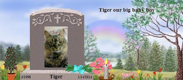 Tiger, You were the first one we got in Hawaii in June of 1998. We about lost you two times before and you cheated death and pulled through. You have been with us for four different duty stations and loved us unconditionally. Your sister Misty is now along, you would lay with Misty protect her and clean her daily. The last place you lived was a two story house, even to your last day you climbed up the stairs to lay with us and sleep with us. I cry as I write this Big Boy, even though you were with us for about 16 years, it still hurts so much Tiger. It's never easy to let someone you love go, but you bought us so many memories and now you can play with Zombie, Danziq and take care of them until you see us again. Take care and live pain free Big Boy, we love you and will see you again at the bridge.