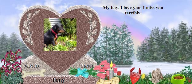 Tony came to me when I was at a very low point in my life. He saved my life. He left when he knew I was on a different path. It was sudden, traumatic, and I can't get past my grief. He loved to go to the local park and go into the water. I cooked for him every few days, which I believe kept him with me for another year. I was so lucky. So lucky. It's almost three years, and the tears keep coming. I can't wait until we are reunited. My God, I miss you.