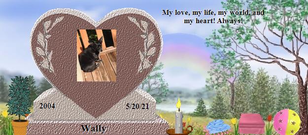I adopted you on the first day your picture was posted by a rescue. Over the years, you battled so much. A painful past, cancer, bladder stones, arthritis, and your single kidney that gave out after fighting so long. You loved to steal my socks and try to take off my toe. Mark nicknamed you Baroo because when you barked, it sounded like you were yelling BAROO!! You loved to play "tear it up" and you had a single green ball that was your favorite toy. No others were as good, only that one green ball. You loved your sisters, even though you did not like to admit it. There were times when you were the ultimate innocent good boy who wouldn't dare steal food, although you had your moments when that would falter and you could not resist. I could not think of getting upset at that face. You were so proud of yourself when you were able to snatch food off a plate. Your favorite place to get food was the BBQ place in Denver. As soon as we pulled up, that nose would start sniffing like crazy and you were so excited. And snow, oh my goodness my little boy you loved snow!! No matter how many trails we dug out for you, you jumped right into the snow with this goofy grin. Wally, you brought me so much joy and happiness. Being your mommy was all that mattered. I am so blessed to have had you in my life for so many years. To tell you goodnight every night, to tell you good morning. To hold you and sing to you and love you. You are my love, my life, my world, and my heart. I love you more than anything in this world, in this universe, in this galaxy. I love you more than all the planets, the stars and suns and moons. I love you more than comets and cupids and donners and blitzens, and rudolphs. I love you more than all the oceans, the seas and rivers, the mountains and the valleys. I love you more than all the sand in all the deserts and beaches. More than all the snow and the icebergs and glaciers. I love you more than the forests and the jungles and I will for a million billion infinities. Til I am with you again, til I can hold you and kiss that nose, remember that Mommy is here loving you. That your Gmama is here loving you and we are missing you! You are the goodest of boys, my Baroo, toodle boodie, my love. May 26... One week ago, we had our last night together. You had cheeseburgers, chicken nuggies, and french fries. I had one more night to hold you and tell you what a good and wonderful boy you are. Thank you my love for giving me one more night with you to love you.