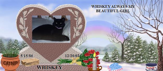 | Whiskey was my companion for almost seventeen years. From the day that my Mother and I brought her home at age 16 and I laid her to rest at 34 she was the love of my life. Although in the last few years with me moving out on my own I didn't see her everyday, but I always knew she would be in great hands with my Mom and Dad and she was. I would visit her at least once a week when the weather and work permitted and it was like I never left. She would come to me if she was outside and greet me with her "hello" meow or if she was inside sleeping, as soon as I snuck into the room she would roll over showing me her belly along with her giggle-like purr that I have never heard from any other cat. She was very intelligent, loved to have her picture taken, always grooming herself, and would eat at the table with us especially on Sunday when I would visit, sitting on her own chair awaiting for her portion to be cut up in her bowl and placed there to her delight. She would leave in the morning especially if the weather was nice like going to work and always return around 3:00p.m. like another day at the office done. At Thanksgiving her favorite, she would have all the turkey she could eat and eat she did! At Christmas she would get a bright green bow to wear around her neck when she would decide to come downstairs and join the rest of us for the festivities, and a red one when she would become our SPOOKY Halloween cat. Her favorite toy believe it or not was a plain old paper bag that she would spend hours in teething around the edges when she felt like it, and zooming around the house for no apparent reason at all giggle-purring as if wanting to play tag with me. She always got what she wanted when she wanted it and was showered with love from all of us. She survived 2 dogs, the last passing in 2000 and when it was her time She went out the way she wanted at home, in the kitchen where she would await all kinds of snacks to be served to her and by herself because she didn't want any of us to see her go. My mom was lucky enough to be able to say good-bye to her that morning before work and I was the one who found her later that day. That will be one of those moments that I will always remember where I was. Strangely enough, I could not get out of bed that day early to check on her as if something was keeping me there making me fall behind schedule. I'll always believe that she wanted to go alone although she fought hard the last several days as if she really didn't want to. Towards the end, she spent her days under my bed away from everyone and I would sit there petting her softly, so she would know she was not alone and that I was there. She died quickly of Glandular Lymphoma despite everything we did to help her. In the end all we could do was make her as comfortable as possible and I am glad that I had that time although heart-breaking as it was to make sure that she knew how much I really loved her. We laid her to rest in a special casket my father built and we buried her under her favorite pine tree in the back yard under a clear sky. You always know in the back of your head that one day your special one will go but you're NEVER really prepared when it does happen. I will always miss my Beautiful green-eyed princess, my friend and companion, and you will always be in my heart. Sleep well my Wowie, I will always love you. Anthony |