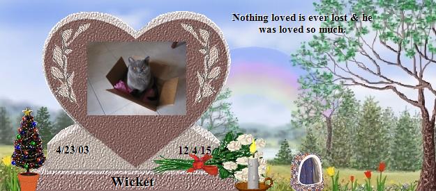 Hello, dear little blue boy. Two days now you have been gone from me, a very long and lonely two days. But today we are better, Zoe and I, knowing that you are happy and no longer suffering. We look into each other's eyes, and we are thinking of you, both of us. So many people have shared so many words of sympathy and comfort. You can see them all in your guest book. Jan has been my rock, as she always is, and I think she has shed as many tears as I have. Barbara too; you made a complete conquest there, and she not a cat person at all. You had that way about you; one look at you and every single person fell in love. Martha said she will miss her buddy so much. Lyra and Stewart are as heartbroken as I am. Did you see your picture as my screen saver? I was looking at all the photos of you taken since you first came to live with Jack and me and found that, and it is my favorite of all. Lyra is going to make me a print that I can frame. I laughed at some of them, of you drinking water from the bar sink faucet in Weed, or sleeping in the sink, and drinking from that Ocean Mist fountain I had in the window, or just lying flat out on your back with all four feet in the air, totally relaxed on the kitchen island. I was very sad to see that because by the time you came to live with us, I was using solely the digital camera, I have no prints of you but one Toni sent to me when you still lived with her. So Jan and Don are going to print some of the ones I emailed to them for me. There are lots of photos of you and my Jennie in my albums on my computer. I am sure you and Jennie have found each other by now and are so happy to be reunited. And you will have met my darling Tiggy Winkle, too. You and he and Jennie will have each other to play with. And Tutu is there, too, so be sure to find him and he will be another good friend. You heard Dr. Wilson say to you "go now, and chase butterflies." I am sure there are plenty of gorgeous butterflies for you all to chase at Rainbow Bridge. Ah, Wicket, I do miss your adorable fat little face, and your totally stunning golden eyes, round as an owl's eyes. You had a look of perpetual surprise with those perfectly round eyes. A completely perfectly beautiful little boy, you were, and now you are again. Please forgive me Wicket, if I did not hear you soon enough, begging for my help, and if you were hurting those last days. When I saw you taking so long to lie down, I wondered if it was because you hurt somewhere. My sadness at your absence is tempered by the sense of relief that you are not still tied to your thin little body, and so miserable all the time that all you wanted to do was sleep. I will be here often, my Wicky, to talk to you and remind you of times you made me laugh so hard, and all the love you gave me while you were part of my life. I send you love, so much love it is immeasurable. Night-night for today, sweet boy. 12/11/2015 December 5, 2015 My dearly loved wee boy, even though it was the most difficult thing I have ever done in my life, I did what you had been begging me to do for over a week, and sent you home to Heaven yesterday. After months of struggling to eat when you did not want to, of being so thirsty that no amount of water you could drink would quench it, of spending all of your days and nights just sleeping in order to shut out your misery, I had to think only of what YOU wanted, and not my desire to keep you with me a little longer. I thank God I had just found a new vet, who is another angel He has put in my life when I most needed one. You must have known that, because you were not afraid of her when she came to our home yesterday. You were so good, little Wicky, and just stayed lying in your furry bed when I put you there, while she gave you a bit of tranquilizer, and while we talked to you and you laid your head in my hand and we waited for the medicine to take effect. I could feel you just going relaxed and limp, and I do believe you were already asleep and at peace by then, even before she gave you the medicine that sent you off, saying as she did so "Go now, and chase butterflies." And you were gone from me, so quickly, so quietly, so that I could hardly believe you were gone, until I lifted one little soft silver paw up an inch and let it go, and it just flopped back down limply. Your gorgeous gold eyes were closed, and your spirit had flown away in mere seconds. I am so grateful to God for taking you home and into his arms so gently and so easily. And I am grateful to him for giving me the strength and courage to keep to my resolve, and to let you go. My wee Wicket, thank you for all the joy, love and laughter you gave me over 12 years of your life, which now seems so short - and yet it feels now as if you had always been with me for my entire life. The house is so quiet and feels so empty with you gone and just Zoe and me here. I miss you so that my heart aches constantly, and tears come so often and at the oddest moments. Zoe misses you terribly, too. She follows me around, or just sleeps, and she does not even care to eat much. She knows you are gone and not coming back, though, because she has not once that I have seen gone into the guest room and looked for you under the bed where you had taken to sleeping in the past weeks, where it was dark and warm and quiet I tried everything to make you well, but kidneys can't be fixed, as the vet said, and you tried, too, for a long time. I suddenly remembered Tom, my vet in Shasta, saying to me when I had to let Jennie go years ago, that we love our pets so much that often we forget what suffering they may be enduring. That was three days ago, and I made my decision instantly as I recalled those wise words from that kind and caring man. You are safe now, happy and whole again, and a huge weight has been lifted off me, knowing that I truly did the right thing in letting you go. And you do not need to worry about me, my Wicky. I am so sad and lonely and missing you so, but I can f