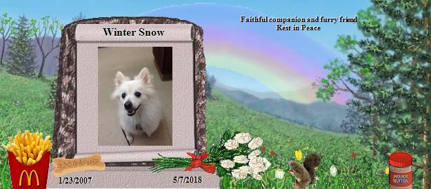 Winter Snow was one of four puppies in the litter, the biggest of the pups. He and his brother, Dusty Brown, came to live with me when they were only 8 weeks old. From the start, Winter Snow was eager to be with his human (me). He spent countless days as my sofa companion, watching TV with me or just laying nearby. He had a soft, snugly coat and he enjoyed being petted and hugged. Winter Snow developed an abnormal gait in his first year that led to him developing chronic lesions on his back paws. Despite often having tender spots, Winter Snow enjoyed running in the yard, chasing the backyard birds, and barking at the dog next door through the fence. He never let his condition stop him from enjoying being a dog! Winter Snow ultimately developed a skin disease that ate away at the tissue on his rear paws. When the vets suggested that he would require a double amputation, I decided that it would be cruel to make him live his life as an invalid. I made the tough decision to put him to sleep so that he would end his life here as a happy dog, knowing that he was loved. I will miss Winter Snow and his loving companionship. His brother, Dusty Brown, lived another year with me until he joined Winter Snow over the Rainbow Bridge on August 15, 2019. I pray that the two of them are running and barking with joy in heaven and snuggling together for naps in the eternal sunshine of God's love. I will carry the memory of Winter Snow in my heart always. I love you, Winter Snow, and I thank you for your love for me. Please also visit Dusty Brown. |