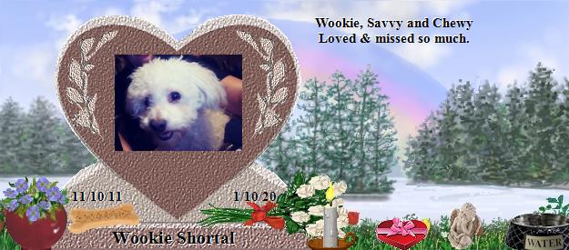 Wookie was half bischon frise and half poodle. He was a very anxious pup, didn't trust people right away. You had to earn his trust, but when you did, he loved you like no other. He was the first one to greet me at the door when I came home from work (or the grocery store, or outside for that matter) with jumps and twirls and smiles. He always sat on the couch back rest, making sure his paw was on my shoulder. He followed me around the house just like a tiny, quiet shadow. He would literally push me to the kitchen when it was treat time before I went to work. He would play with me when I would say, "I'm gonna get you, Wookie" and he would run and when I caught him, he would jump into my arms. He would not beg for food, when we sat down to eat, he would go to his bowl and eat his own dinner. He was pure love and acted just like a precious puppy. Wookie was just so, so special and so, so sweet. When your dad left out of state and couldn't take you, you waited for him for 2 weeks on his bed. He missed you so much. I finally managed to get you to stay in my room with your momma, Gaby, who babied you like crazy. I loved to see you cuddle up to her. She has also missed you so, so much and was so sad, she would not leave her bed. Wookie, I am hurting every day that you are not with me, keeping my feet warm at night, watching TV. You brought me so much joy and happiness, especially in my times of sadness, depression and anxiety. One look at your precious little face and all my problems melted away as if putting things in perspective that nothing is more important than love. I miss not seeing you at every spot one of your favorite spots to be. You were eager to please and jumped for joy at your every "good boy" exclamations. I've never seen a pup smile the way you did... and how much you loved for me to scratch your booty. I hope you can forgive me for not fighting harder for you. For not giving you a fighting chance, knowing the fighter that you were. I'm sorry for not taking you home and caring for you myself. You wanted to come home with me when you heard my voice. I'm sorry for not asking the right questions when it came to your health. I'm sorry for my cowardliness of not being with you at the end. For only thinking of my selfishness and not wanting to see you that way. My face should have been the last thing you saw before you closed your precious little eyes forever, being comforted in my arms, telling you how much I loved you. Please forgive me my dear, dear Wookie. Forgive me for not taking you out for more walks and more doggy park visits. And not giving you nearly as much love as you gave me. My heart hurts because you left a huge hole in it. I never thought you would leave me so, so soon and what an incredible impact you truly made in my life. I miss you. And I hope one day we will be together again. I hope you jump and twirl for me to welcome me home. I LOVE YOU, MY PRECIOUS WOOKIE. Sophia and Jared have very special memories of you, which I know they will share. They were crazy about you and know that Savvy, your beautiful and precious sister, was there to welcome you to doggy heaven... which I know exists and I know is the most special place ever.January 18, 2020 Today, I took Chewy and Gabby, your momma and dad on a short hike. I found a medallion on the ground as I opened the passenger door (added pic) .. a beautiful sign of comfort. I miss you so much Wookie. I so wish you were still with us every single day. My tears continue to fall and such a great sense of loss and sadness overcome me. I love and miss you so much, my previous Wookie. January 24, 2020 My precious Wookie, I miss you and your sister, Savvy so much. Some days are easier than others. Everything at home reminds me of you, every spot, every treat I give your mom and dad, every day I walk in the door, every walk we take. I just think about how happy you would have been with us. I try to stop myself from thinking past the good memories because then I get just too sad and miss you too much. My precious furbabies, I love you so much. I hope you are loving your new place and making many friends and bringing so much happiness. Watch over us as our little angels that your are. I love you. January 30, 2020 My special little Wookie, yesterday, we took your momma and dad for a walk. We like to go to a football field near the house, I'm sure you remember. We let them off the leash to run around and chase each other and all I could think of was how much you loved that and how happy you would get doing your twirls and jumps. Every day, there is always something that reminds me of you or we do something that I know you would have loved. It's been really hard not having you with us. All I want is you back. I try and not think too much about you being gone, because then I'll just start crying. I try to stop thinking after a good memory. Monday, I lit 3 candles for the Memorial Ceremony. I have your ashes next to your sister's cuz I know you are together. I will do another Memorial on Monday and say some prayers. I am so grateful for so many words of comfort from furbaby parents who have been through the same loss. I love and miss you every single day, my precious, Wookie & Savvy. February 11, 2020 My precious, baby Wookie... I miss you so, so much. I think of you all the time, literally. Your momma, Gaby misses you and is still so sad. You two were inseparable, always playing and chasing each other. I loved watching you play so much. Everything we do with your momma and dad just makes me wish more that you were with us. You deserved all the happiness in the world because that's how much happiness and joy your always brought us. I miss you so, so much. As I sit here and type this, the tears just keep falling. The day we are together again will be a day of pure joy to see your little face again. I love you, my little baby Wookie... give puppy kisses to Savvy, please. December 21, 2020 Precious Wookie... I think about you so much... 