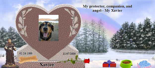 So many wonderful memories!!! We had great adventures- romping through the woods, over mountains, and to the lakes. You loved traveling in the car with us across the country and we loved your smiles and playfulness along the way. All those long running miles logged to help me train for events.Snowshoeing and playing in the snow. Finding a creek or river to play and relax in. And of course the snuggling and relaxing reading the the paper. You were always protecting me and there for me. Whenever a tear came out of my eye you were right there by my side with your head on my lap. I loved how you always wanted to help. You would pick things off the floor and bring them to where they belonged and you learned new things so quickly. I loved the high fives and the bone balancing on your nose! Well angel bug we had many fun years together with so many memories that will never be forgotten. We were together to the end and you were so strong. I will always remember your smiles, which bring joy to my heart. You are one tough teddy bear! There is a great emptiness in the house, a strong, energetic, gentle, protective spirit has been set free. He has left his body behind so he can enjoy the things he loves so much- running, playing, hiking, and enjoying a cold stream or a big pile of snow! He is a loyal companion and a best friend with unconditional love- he will always be in my heart. You are so loved Xavier! Thank you for your love! 12/06/10 We miss you buddy. I hear your hellos in the sunrise each morning and I feel your kisses in the sunset each evening. You are one special dog, my love bug. Thank you for watching over me still, having kind hearts send messages to comfort me. 12/20/10 Xavier we miss you so much. I thought of you with every step I took today up the mountain for the Solstice snowshoe hike. You always loved to play in the snow every chance you got! Well Christmas is almost here and we will miss your anticipation in opening presents and the fun you had when you finally got to open them in the morning. XOXO 1/06/11 When I walk through the snow I can see you making doggie snow angels. Love you bug! 1/26/11 Many hugs and kisses on your birthday! I miss you everyday and I know you are always by my side. 2/07/11 Thinking of you my Angel! 3/09/11 We have had a lot of snow, you would love every bit of it- running and laying in it! 5/07/11 Xavier you are with me every day- especialy when I run(you give me the extra energy) Thank you for watching over me. I love you angel bug! I am thinking of you everyday and I know you are with me...kisses and hugs... 11/07/11 Went to the top of the mountain with you by my side. Prayer flags for you. Love you. Thank you for all your help and being there for me, giving me strength! |