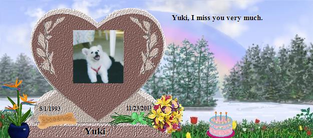On Thanksgiving day, I cooked a turkey for you, but you couldn't eat it. I knew you were pretty sick, because all your life, you loved to eat and would never refuse food. I called a doctor to come see you, and you had a very high fever. He gave you a shot to make you better, but then had to leave because he was going out of town. You didn't feel any better and were in a lot of pain, and I could see that the doctor didn't help you, instead you felt worse, not better. I am so sorry. I had to call the emergency vet, but it was a holiday and no one was around, but they agreed to meet me at their office. I called Hugh and he came right away, and we tried to get you in the car. We couldn't move you because you were too heavy, and I begged you to help me get you in the car. You lifted your front legs up onto my arms and let me walk you out to the car, and we were able to get you up into the car. The doctor met us at the hospital and she said she'd take care of you from there, and that I could hopefully take you home tomorrow. The doctor asked me if I wanted to say goodbye, and I said no, I didn't want to say goodbye, I wanted to take you home tomorrow. I regret that I didn't say goodbye, because you died the next day. Yuki, I am so sorry, I should have said goodbye to you, I should have given you a big hug, you are my life, you are my spirit. You were mine since you were 8 weeks old. You were my companion and my good friend, you loved me unconditionally and I loved you as well. Now my life is so empty. Every time I come home you are not there to greet me, and I miss that so much. How I wish you were there, but you're not -- you are gone for good. I wish you peace and that you are in a good place to rest. Perhaps you might be able to look for Tigger up there, she's been there for over a year. Maybe you can reunite and keep each other company and you won't be alone. I love you. 2012 - One year ago on Thanksgiving, you were gone for good. This year Kale cooked a turkey at his house, and I was thinking of you all day. The very next day, i made a turkey dinner to remember you. I wished you were there, you would have loved it. A year ago today I made a turkey dinner for you but you refused, you were too sick. Then I knew you were very sick, because you loved turkey. Ever since then I've missed you so much! Every day when i come home, you are not there to greet me. However wherever you are, I hope you have peace and happiness. I love you. Mama. 2013 --Dear Yuki, I am thinking of you today on Thanksgiving, two years since you left me. I miss you so much and have been thinking about you all day. I lit a candle for you and put it on the table on the deck with some flowers for you. I love you - Mama. Hi sweet Yuki,this is Aunt Debbie. I am sure you already know this, but your mama Jean left this world two weeks ago at the age of 92. I know it must have been a wonderful reunion when she joined you at Rainbows Bridge and knowing that she was going to be reunited with you and Tigger gave us all some comfort. She loved you more than anything in the world and life was not the same for her after you were gone. Take good care of each other, and give a nuzzle to my Ginger and Tessie up there! Love you, Yuki girl! |