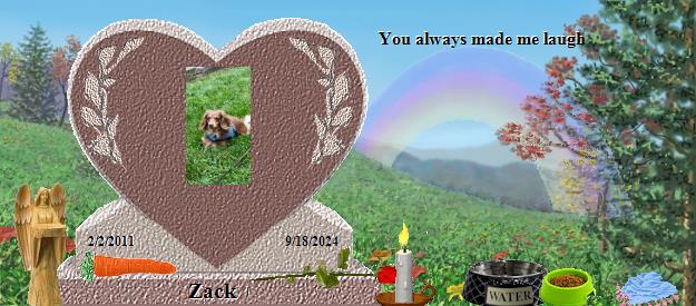 My sweet boy, I had to say goodbye to you this morning. You gave me a few kisses and and snuggled close to me. Zack, you were my sweet little clown. You could always make me smile and laugh. I miss you so much. Brother misses you too. You were beautiful and so precious. I held your sweet head and watched the light go from your eyes. I miss the way you would snuggle against me at bedtime. I miss your little head on my shoulder when I held you. You were very vocal and now it's so quiet without you. Home is not the same without you. I love you and miss you so much. You were so trusting and just so precious. You definitely left paw prints on my heart. I will always remember the way you held your little mouth slightly open and wagged your little tail when I talked to you. And, you always had the last word with that little yelp you did. Zack you were a precious little fellow and will be always remembered. I love and miss you more than words can say. I opened the fridge this morning to give Zeke a carrot. In my mind I saw you running to the fridge, looking up with your bright eyes, sticking your nose toward the carrots. You always wanted to show me where they were. So many things remind me of you. You will always have a special place in my heart. Your ashes are in a beautiful urn and I have have a lock of your hair and also a footprint. No longer can I kiss your face, hold you, hear your bark or see your beautiful long hair move with the wind. Now all I have are loving memories that are with me every day. |