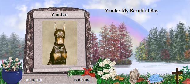 08/09/2008 Hi my boy, it's Saturday again; there was not a lot going on this week, but I have been dreaming like crazy mostly of the people who were very important in my life, but have now passed. I also know that you were there. I believe that this was a message telling me not to worry about you, that you are fine and know that I still love you more than words can say . Well Zianna is doing better she is still so lonely but has become such a daddy girl, not that both of you were not spoiled, lets just say that she is so spoiled LOL. Run and play with all your new friends, and at night take Zar & Zia and go home to Davy he will always take care of his auntie babies, until mommy or daddy come to get you. Love you Zander Mommy XO 08/16/2008 Hi my baby, it Saturday again; today is Grandpa Frank birthday in heaven, give him a big Dobby kiss, and tell him how glad you are to finally know him. I was remembering when you were born and the breeder called me and told me that I could come and see you at 2 weeks old, I was so excited. I met you biological grandma (she was so beautiful). Well to get back to the story, the breeder also raised cockatiels. And your Dobie grandma (Shara) came down with a baby bird in her mouth to show me, the breeder was laughing because she loved the birds and would go to the Avery and visit and take them out for a little, and never once hurt one. The gentleness she showed with all 9 of you little babies and the bird's was truly amazing. It was at this point that the breeder told me if Shara your grandmother did not show me her baby birds or if she block me from her (Cheena) your mommy's babies all 9 of you little ones, I would not have been allowed to buy you, because her judgment of a person was always true and accurate and that what the breeder went by; also your full name my boy is (ZZ Rouge Guerrier Alex-Zander). You also took commands and as Papa would say spoke French it was so cute when Papa would say (s'il vous plait monsieur) you would come running. Zander my baby I brought you home at 7 weeks old and had you for 8 years you were a true joy and I love you very much Mommy (Dee) XO 08/23/2008 Hi my big boy, it Saturday again, this was a hard week for me I have been missing you so much, but I am content with knowing that you are safe and happy with so many new friends. I just want you to know that daddy Zianna and I miss you so much. Give everyone kisses for me and take good care of Zar & Zia; oh by the way if you meet two warlock Dobie boys also named Zander, they also are mommy boys, from so many years ago each of you so very handsome and loyal and meant the world to me, but you my boy capture my heart and the emptiness is so profound at times. Love Mommy 08/30/2008 Hi my baby, another week has gone by, and well let just say I miss you more than words can say. I was talking with Uncle Dave this week and he was telling me he had a dream about Grandma Anna; daddy said he also had a dream of her. In both dreams she was sad, please go and find Grandma and give her big kisses take Zar & Zia with you she knows them and she will be so happy to see them; I also know that she will just love you. That all for now my boy, you are forever in my heart, and I carry you with me wherever I go. Love Mommy (Dee) X O 09/06/2008 Hi my beautiful boy, it been a little over 9 weeks, since you left and went to Rainbow Bridge; I still am so very sad but I need to start celebrating your life. You have made so many wonderful new friends; Mac, Puck, & Lucky just to name a few. I have received wonderful messages in your guest book, and I have read so many stories about other beautiful fur angels that my heart rejoices in knowing that there are so many wonderful people who care so much for there babies, be it canine, feline, birds, reptile etc. you are all what I consider one of God's greatest gifts to us humans. September is a busy month, Daddy birthday on the 24th and Jon on the 21st. I know that you will be there in spirit you so like a good party. Zianna is such a spoiled daddy girl that I now have to cook for her, you never were a finicky eater, and I now believe that she only ate her food to spite you. After trying everything, and she stick her nose up, I started making her meals and she is doing good with them. Well today is your Granpa Dave (my daddy) birthday in heaven, bring everyone to his party and give him the biggest kiss for me. I am putting pictures of your biological mommy, daddy, granddad and great granddad on your site. Take care my sweet guy, and remember you are forever in my heart, Love you Mommy (Dee) 09/13/2008 Hi my boy, I am so happy that you came to see me, it was one of the best moments in my life; I am still trying to find out who brought you thru, it was a face from 35 - 41 years ago I know he passed in a very bad accident and I have some people trying to research it. I know where and I believe I know the family name I would like for them to know that he is ok; but for now I know you are ok and that means so much to me, Love You Mommy (Dee) 09/20/2008 Hi my big bug the phone lines on finally back on so I have so much to do. I did see you this morning, just for one brief moment when Zianna was out and you went running thru the back of the yard, she came running in the house so fast I know that she was confused and a little scared . Uncle Dave is driving to Florida if you and your friends can make the stars shine brightly for his journey please do. Daddy birthday is this week and he misses you a lot. Take care my love bug, you are never far away, always in my heart Love Mommy (Dee) 10/03/2008 Hi my boy, I am finally all set with my internet, the month of September was a nightmare. I only had my PC in work so I visited you each morning along with Mac & Puck, Lelja babies. well it is October, where does the time go; I am missing you like crazy you were my shadow and I cannot stop thinking about the void in life without you. I felt like this when my Mom & nephew Da